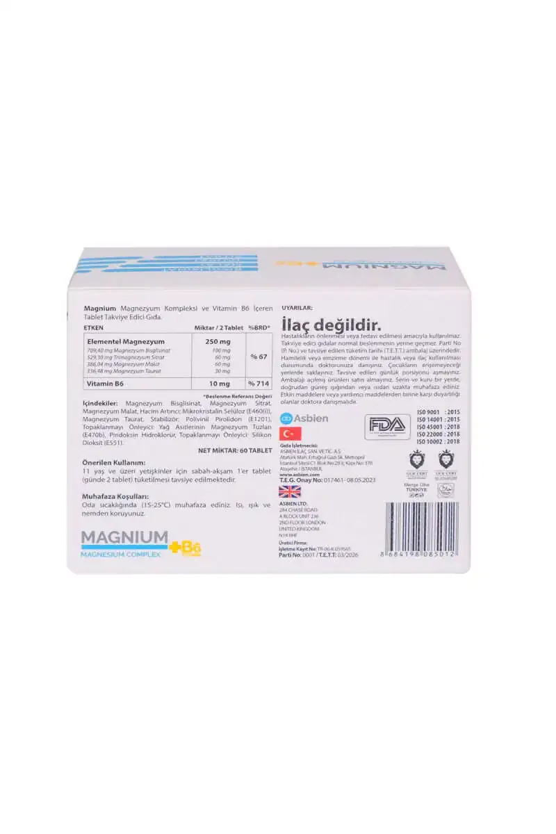 Magniy Kompleksi B6 - bu tanangizning sog'lom ishlashi uchun zarur bo'lgan magniyning turli shakllarini o'z ichiga olgan oziq-ovqat qo'shimchasi. Har bir tabletka Magniy Bisglytsinat, Sitrat, Malat, Taurat va B6 Vitamini (piridoksin gidroxlorid) mavjud. Ushbu maxsus formula tanaga magniyni yaxshiroq so'rib olish va foydalanish imkonini beradi.