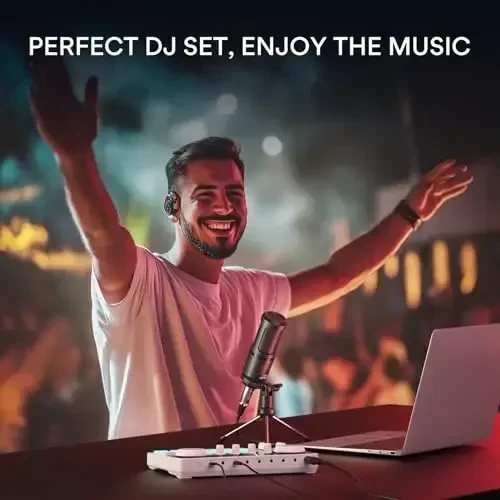 Maono MaonoCaster Lite Портативная Подкаст-Студия: AU-AM200 - это универсальное решение. Он функционирует как звуковая карта, микшер, сэмплер и регулятор громкости. Интуитивно понятен и прост в использовании для подкастов, радиошоу, прямых трансляций и многого другого! ОСОБЕННОСТИ: Plug and play: Совместим с Windows и macOS, не требует загрузки драйверов. Совместим со смартфонами, планшетами и многим другим. Расширенное микширование и простое управление: Легко управляйте уровнями звука с помощью четырех специальных ручек регулировки громкости. Оснащен специальными кнопками для добавления специальных эффектов. Поддерживает одновременное подключение нескольких входных устройств для многоканального микширования и более легкой настройки. 6 звуковых FX и 4 изменения голоса: AU-AM200 имеет шесть предустановленных кнопок вокальных FX и четыре изменения голоса для добавления забавных эффектов в ваши записи. Мониторинг наушников в реальном времени: Оснащен выходом для наушников для чистого звука. Вы можете отслеживать свой голос в реальном времени во время записи.