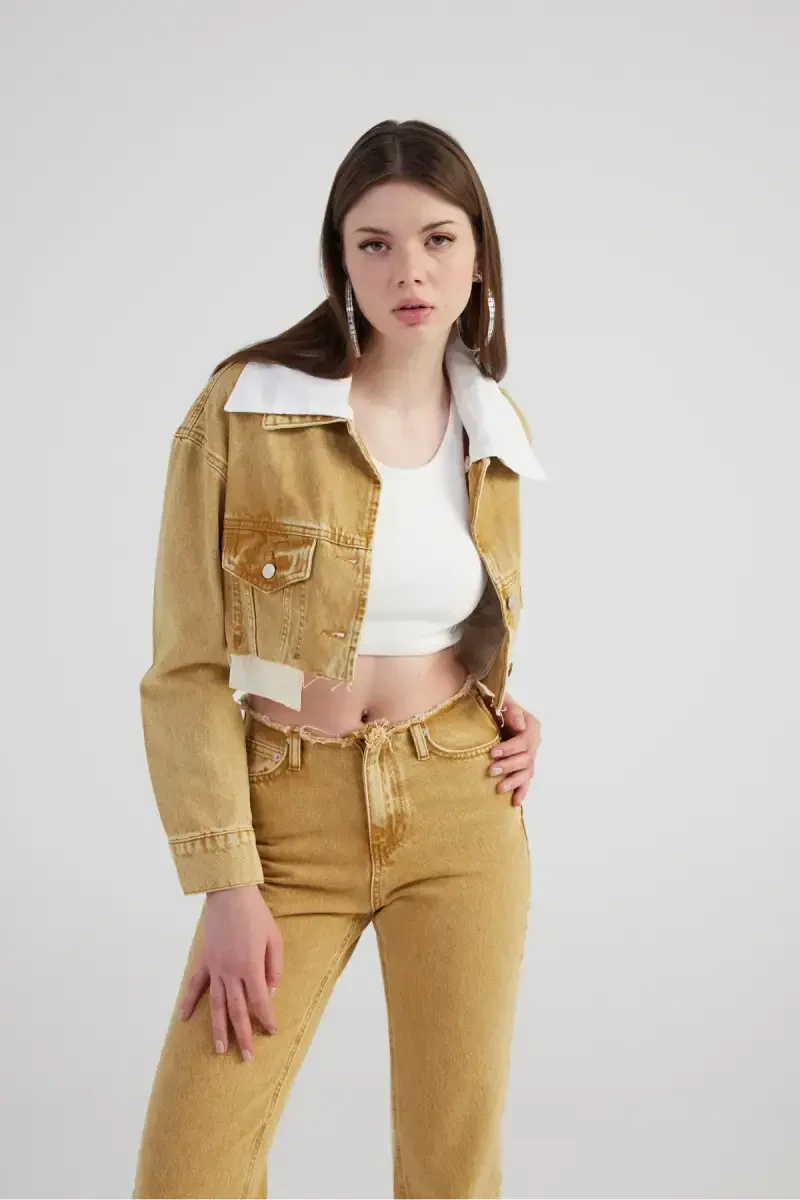 Marble Patterned Removable Collar Detailed Crop Cut Pocketed Rusted Jean Jacket Camel is a candidate to be one of the most striking pieces of your wardrobe. Offering both a stylish and comfortable look, this jacket stands out with its different details and modern cut. It allows you to reflect your style in special moments as well as in daily use. This jacket, carefully designed by Holly Lolly, offers long-lasting use with its high-quality material and workmanship. The marble pattern adds a unique touch to the jacket, while the removable collar detail allows you to make different combinations. You can achieve a stylish look with a classic polo neck, or create a more sporty style by removing the collar. The crop cut adds a modern and youthful look, while the pocketed design offers practicality. The pockets, where you can easily carry your daily belongings, increase the functionality of the jacket. The rusted jean texture adds a vintage feel to the jacket, while the camel color easily matches with all kinds of outfits. Whether you combine it with jeans or complete it with skirts or dresses, this jacket always ensures you look stylish and fashionable. Thanks to its 100% cotton material, it has a skin-friendly and breathable structure, which provides comfortable use throughout the day. Its regular fit provides a comfortable wearing experience by adapting to every body type, while its straight cut creates a timeless style. The long-sleeved design provides ideal protection during seasonal transitions and can be easily preferred in casual environments. This jacket is an indispensable part of every wardrobe with its basic silhouette that appeals to all age groups. In short, the Marble Patterned Removable Collar Detailed Crop Cut Pocketed Rusted Jean Jacket Camel is a product that combines elegance, comfort and usability and will be a favorite of stylish women.