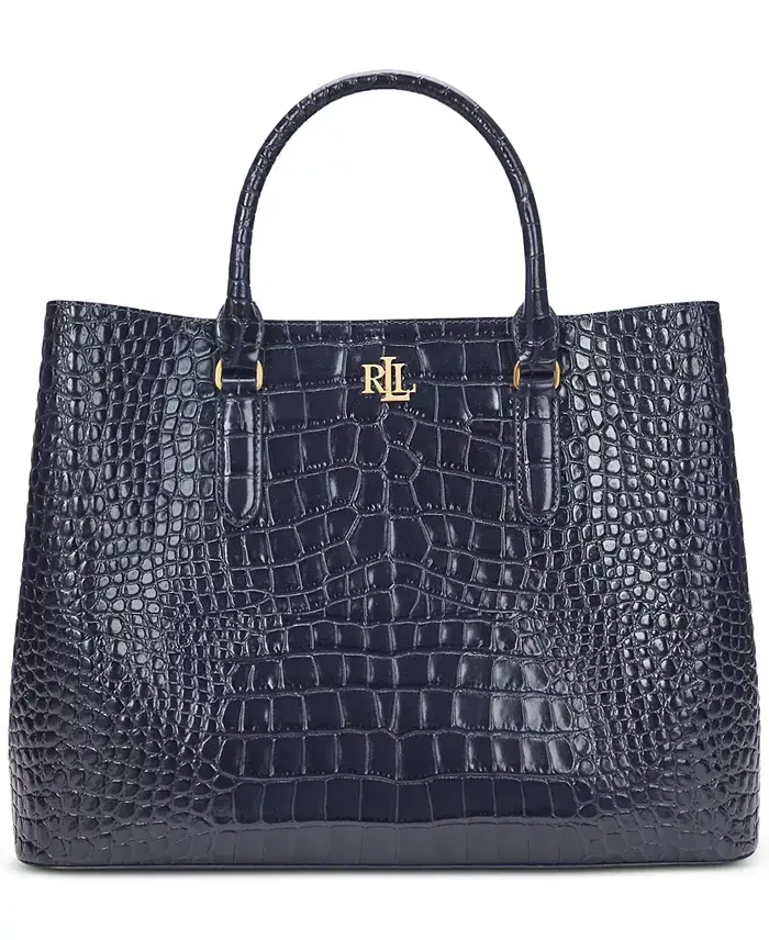 Bringing sumptuous dimension to the Marcy satchel, this large bag from Lauren Ralph Lauren features an array of pockets for organized storage. The sleek, streamlined silhouette is finished with a signature "LRL" metal logo. Large sized bag; 14-1/4"W x 10-3/4"H x 7-1/2"D (width is measured across the bottom of handbag); 2 lbs. approx. weight Silhouette is based off 5'9" model 4-1/4"L handles; 17"L adjustable, removable crossbody strap Dog-clip closure Polished "LRL" metal logo at the front; exterior slip pocket; interior center zip compartment & slip pocket Dust bag included Silhouette is based on 5'9" model Shell: leather; lining: polyester Professionally clean Imported