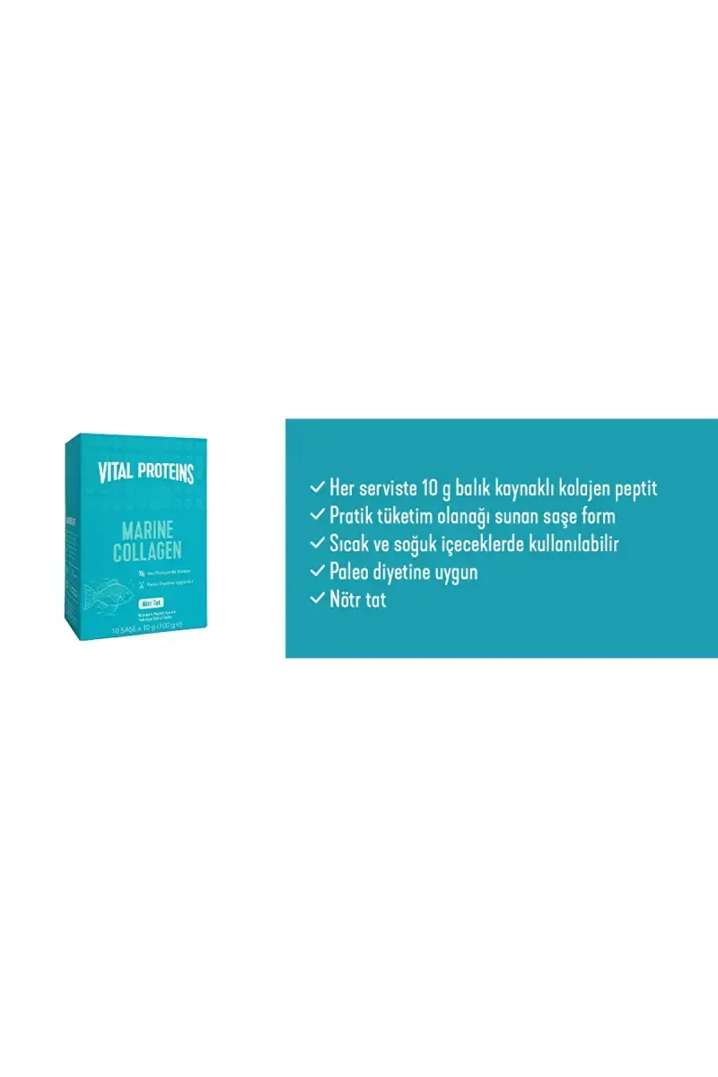 Marine Collagen 10 Saşe X 10 gr Neytral Ta'm, dengiz manbai kollagen peptidlarini o'z ichiga olgan, amaliy va mazali formulasi bilan teringiz va bo'g'imlaringiz sog'lig'ini qo'llab-quvvatlash uchun mo'ljallangan. Undagi yuqori sifatli kollagen teringizning egiluvchanligini va namlik muvozanatini oshirishga, nozik chiziqlar va ajinlarning ko'rinishini kamaytirishga yordam beradi. Shuningdek, u bo'g'imlar sog'lig'ini qo'llab-quvvatlab, harakatlanish qobiliyatini oshiradi.