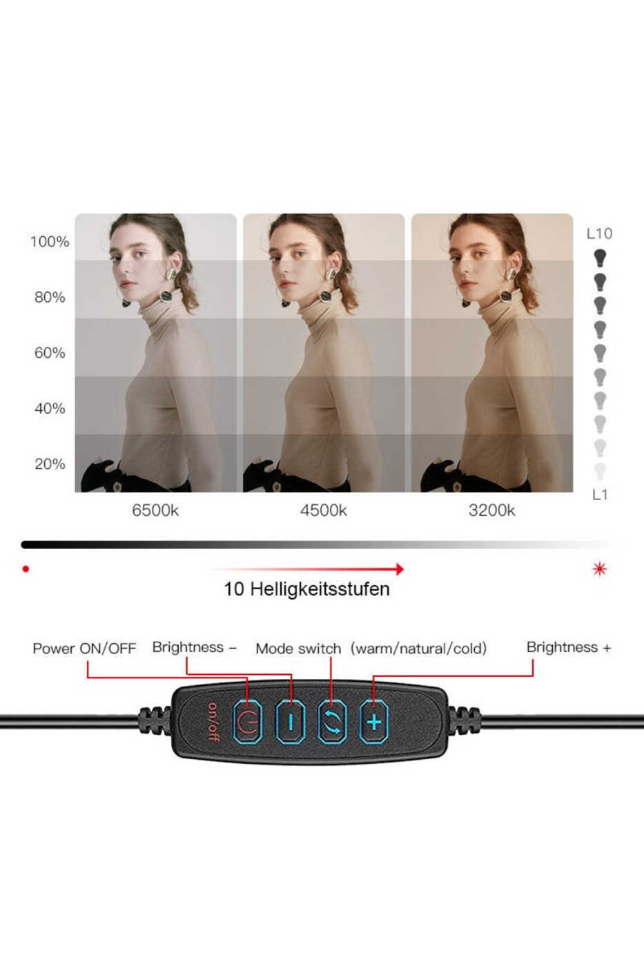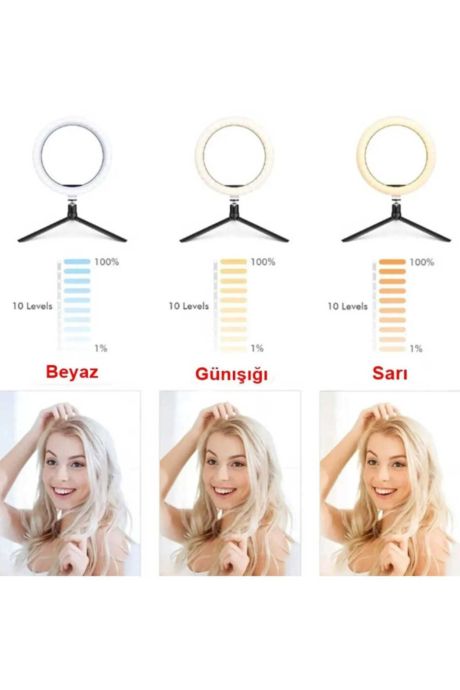 Bu ürün HümaStore tarafından gönderilecektir.Kampanya fiyatından satılmak üzere 100 adetten fazla stok sunulmuştur.İncelemiş olduğunuz ürünün satış fiyatını satıcı belirlemektedir.Bir ürün, birden fazla satıcı tarafından satılabilir. Birden fazla satıcı tarafından satışa sunulan ürünlerin satıcıları ürün için belirledikleri fiyata, satıcı puanlarına, teslimat statülerine, ürünlerdeki promosyonlara, kargonun bedava olup olmamasına ve ürünlerin hızlı teslimat ile teslim edilip edilememesine, ürünlerin stok ve kategorileri bilgilerine göre sıralanmaktadır.Bu üründen en fazla 10 adet sipariş verilebilir. 10 adedin üzerindeki siparişleri Trendyol iptal etme hakkını saklı tutar. Belirlenen bu limit kurumsal siparişlerde geçerli olmayıp, kurumsal siparişler için farklı limitler belirlenebilmektedir.15 gün içinde ücretsiz iade. Detaylı bilgi için [page="return_conditions"]tıklayın .Işık halkası - 1 adet telefon tutucu içeren 2’lü esnek tutucu tasarımı- masa klips tutucu ve esnek boynu ile şık bir görünüm- 3 farklı ışık tonu ayarlama: Beyaz - Sıcak - Doğal- ışığın parlaklığını azaltıp arttırmaya yarayan kontrol anahtarı- dayanıklı ve esnek boyun tasarımı sayesinde uzun süreli kullanım- esneyebilen boyun dizaynı sayesinde ışığın yönünü istediğiniz gibi ayarlayabilirsiniz- fonksiyonel tuşlar sayesinde açma / kapatma ve ışığın rengini istediğiniz şekilde ayarlayabilirsiniz.