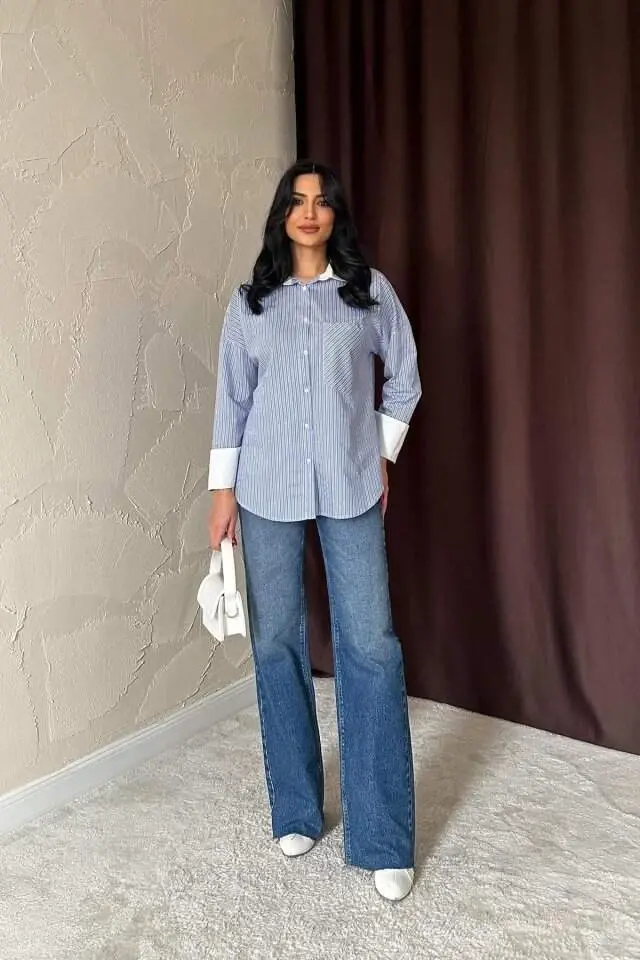 Mavi Çizgili Poplin Uzun Kol GömlekModelin Ölçüleri: Boy: 165, Kg: 55, Göğüs: 90, Bel: 72, Kalça: 100Modelin üzerindeki ürün M/38 bedendir