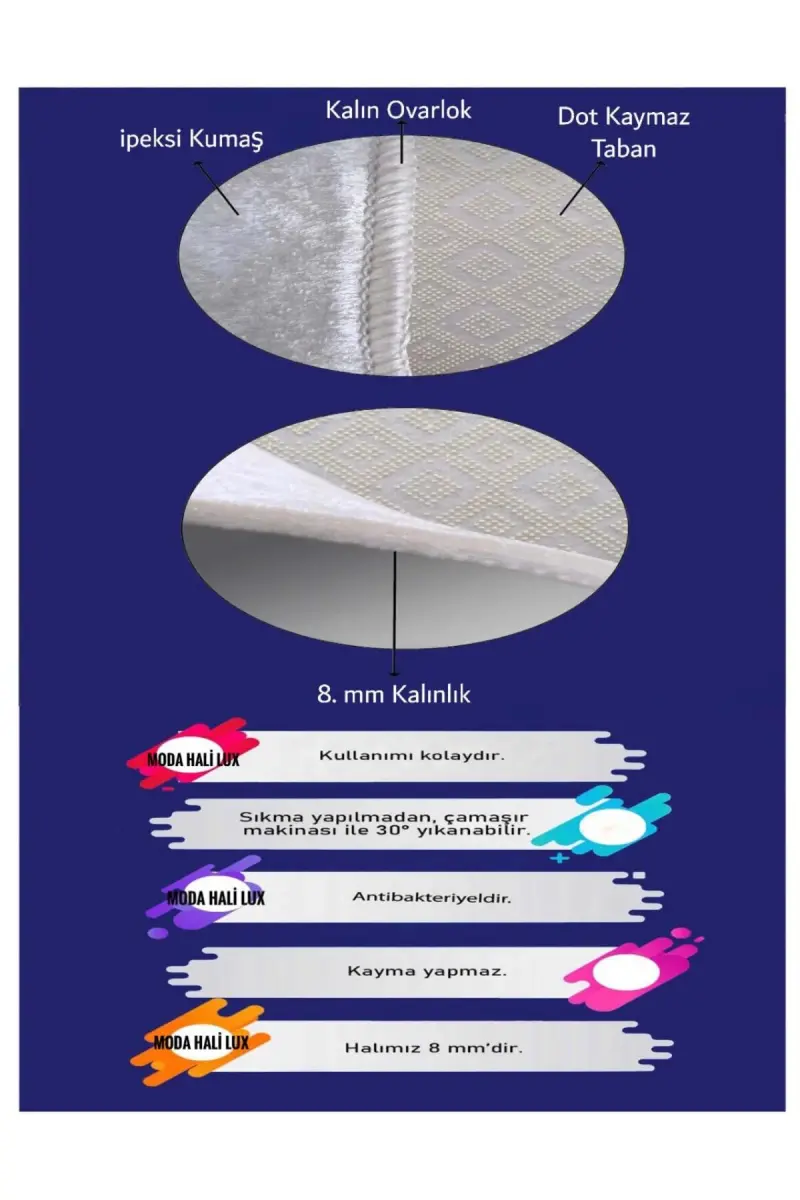 Bu ürün MODA HALİ LUX tarafından gönderilecektir.Kampanya fiyatından satılmak üzere 5 adetten az stok bulunmaktadır.Bir ürün, birden fazla satıcı tarafından satılabilir. Birden fazla satıcı tarafından satışa sunulan ürünlerin satıcıları ürün için belirledikleri fiyata, satıcı puanlarına, teslimat statülerine, ürünlerdeki promosyonlara, kargonun bedava olup olmamasına ve ürünlerin hızlı teslimat ile teslim edilip edilememesine, ürünlerin stok ve kategorileri bilgilerine göre sıralanmaktadır.Bu üründen en fazla 6 adet sipariş verilebilir. 6 adedin üzerindeki siparişleri Trendyol iptal etme hakkını saklı tutar. Belirlenen bu limit kurumsal siparişlerde geçerli olmayıp, kurumsal siparişler için farklı limitler belirlenebilmektedir.15 gün içinde ücretsiz iade. Detaylı bilgi için [page="return_conditions"]tıklayın .ÖLÇÜ SEÇİMİ YAPARKEN KULLANACAĞINIZ ALANI GENİŞLİK VE UZUNLUK OLARAK METRE YARDIMI İLE ÖLÇÜNÜZHav yüksekliği 8 mm 10 mm aralığında yumuşak doku.İçeriği 4 mm sünger 500 gr alt dot taban dan oluşuyor Antistatik, Antialerjik, .Ağır ve Zor Temizlenen Halılardan Değildir.Süpürme Aşamasında Süpürgenizi Halının Ovarlok Kısımlarına Sürtmemeye Özen Gösteriniz Bu şekilde Ovarlok Kısımlarının Zamanla Tüylenmesini Önlemiş Olursunuz Sıkma ve Kurutma Yapılmadan,Yumuşatıcı Kullanmadan Çamaşır Makinası İle 30° Yıkanabilir.Doğaya Ve İnsan Sağlığına Zararlı Madde İçermez.Kanserojen Madde İçermez.Tozuma Yapmaz, Hav Bırakmaz.4 Mevsim Kullanılabilir.Isı Yalıtım Özelliği Vardır.Toz Ve Leke Tutmaz.Kolay Temizlenir.