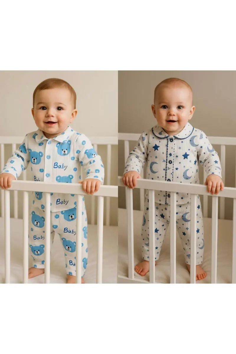 Mavi-Yeşil Çift 2’li Takım Yenidoğan Fitilli Organik Pamuk Kumaş 2’li Kız Erkek Bebek Takım-Mavi