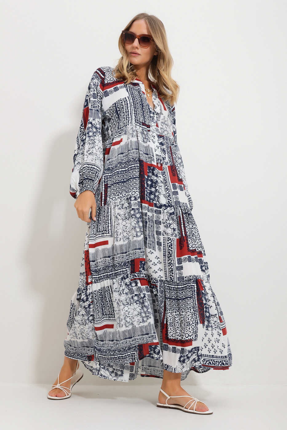You can easily choose this dress for everyday life, special occasions or dinner parties. You can achieve a casual chic by combining it with sneakers, or create a more elegant look with heels. If you want to reflect your style without compromising on style and comfort, the Women's Cinnamon Mandarin Collar Shawl Patterned Maxi Dress Alc-X11593 is perfect for you.