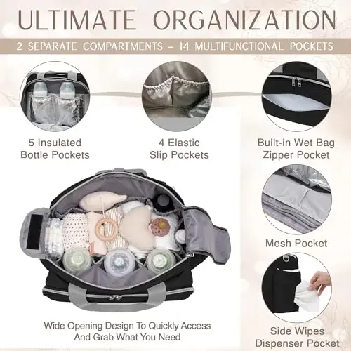 This bag is not just a style accessory, but also a thoughtfully designed product that combines functionality and practicality. Its ability to convert into five different carrying styles offers a solution for every situation and need: cross-body, single shoulder, backpack, handbag, and stroller bag. The backpack straps can be removed when the bag is used as a handbag, and the stroller straps easily adapt to different models. Thanks to its large interior volume and numerous pockets, keeping your belongings organized is very easy. The wide-angle design provides quick and easy access to the contents, while the insulated bottle pockets keep drinks warm. With this bag, you will always be prepared and organized.