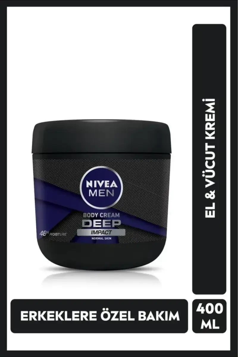 Experience long-lasting freshness and care on your skin with NIVEA MEN Deep Impact Hand & Body Cream! With over 110 years of skincare expertise, NIVEA has developed this cream to meet the specific needs of men's skin. With its day-long moisturizing effect and woody spicy scent, this cream revitalizes and refreshes your skin. Thanks to the black carbon in its content, it provides deep moisturizing without leaving a greasy feeling on your skin. NIVEA MEN Deep Impact is not just a moisturizer, but also a care shield that protects your skin against external factors. It soothes your skin after showering or shaving, relieves tension, and gives your skin a silky softness. This cream, which you can easily apply to your entire body, will become an indispensable part of your daily routine thanks to its fast absorption feature. While providing the moisture your skin needs, it makes you feel good all day long with its refreshing scent. NIVEA MEN Deep Impact Hand & Body Cream helps you give your skin the care it deserves. Trust NIVEA's expertise for healthy and well-groomed skin. The product is suitable for all skin types, including normal, and is dermatologically tested. This cream, which you can safely use on your skin, will be an integral part of your daily care routine. Produced with the highest quality ingredients with NIVEA Skin Care Guarantee. NIVEA MEN Deep Impact Hand & Body Cream, which moisturizes your skin while offering a refreshing and masculine scent, will take your daily care routine to the next level. By deeply caring for your skin, it keeps it moisturized, vibrant and well-groomed all day long. With NIVEA MEN Deep Impact, your skin will always be at its best.