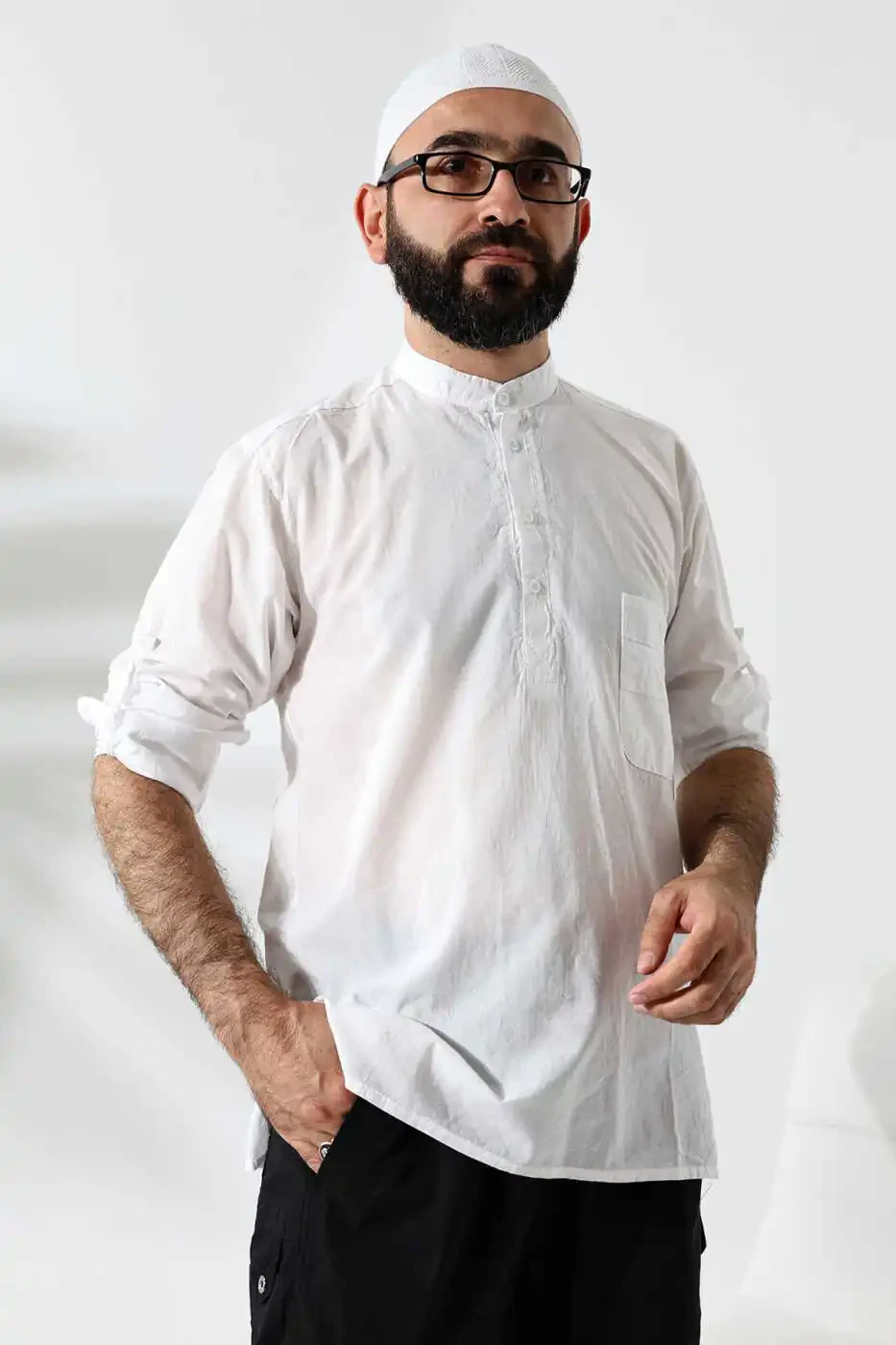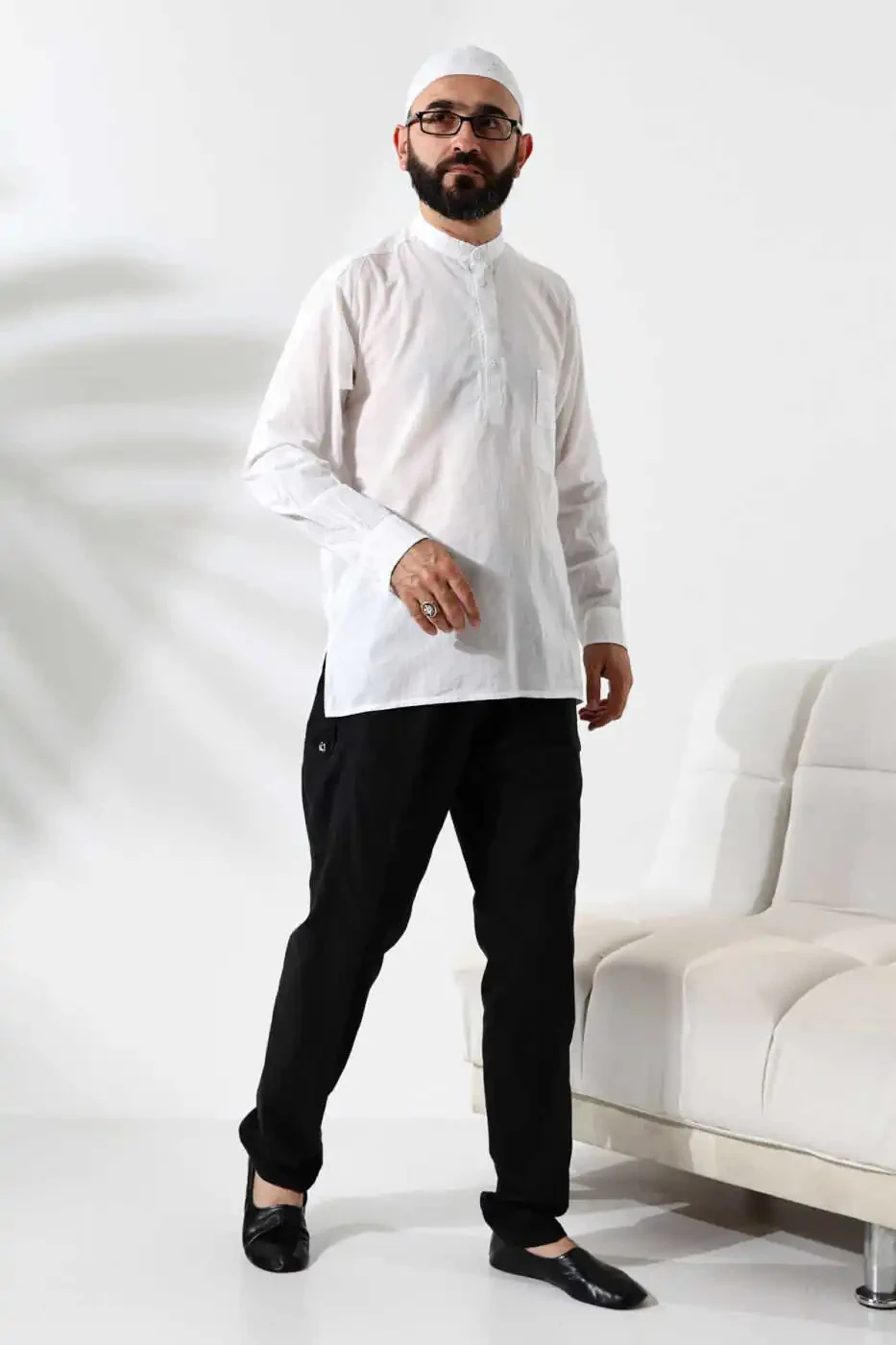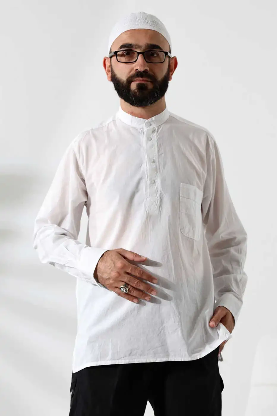 Easily cleaned according to the 30-degree washing instructions, this shirt is practical to maintain. Its long sleeves and standard length make it an excellent choice for transitional seasons. Part of the basic collection, it embodies timeless elegance and comfort. The clergy collar detail adds a modern and stylish touch, making it a popular choice for Hajj and Umrah pilgrimages.