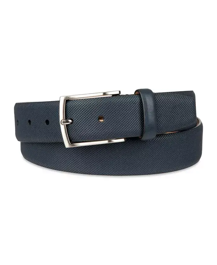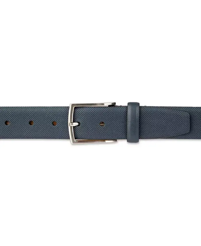 Upgrade any dressy or formal ensemble with this Alfani Stretch Belt, a sleek look with a polished strap and feathered edge. 1 3/8 inch wide feather edge strap Strap engineered with built in stretch comfort Silver tone finish harness buckle Emboss textured strap 7 holes included for an adjustable fit Pairs well with trousers, chinos, dress pants and more For best fit, order one size larger than your pant size: small (30-32), medium (34-36), large (38-40), x-large (42-44) Polyurethane/ethylene-vinyl acetate Wipe clean Imported