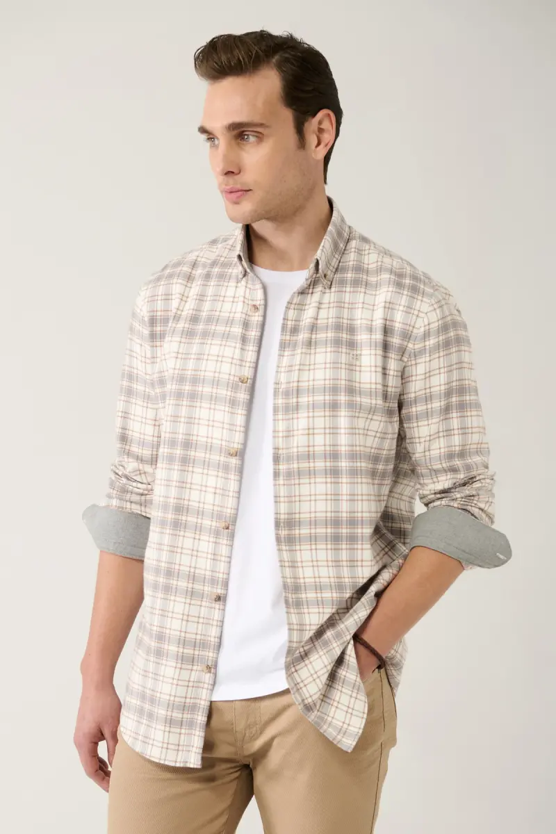 Make a statement with this stylish and comfortable men's beige shirt! Crafted from 100% cotton fabric, the shirt offers all-day comfort with its soft texture. The button-down collar and plaid pattern create a classic elegance. The regular fit design suits all body types and provides freedom of movement. This stylish and practical shirt will be a perfect choice for any occasion, from business meetings to casual combinations.