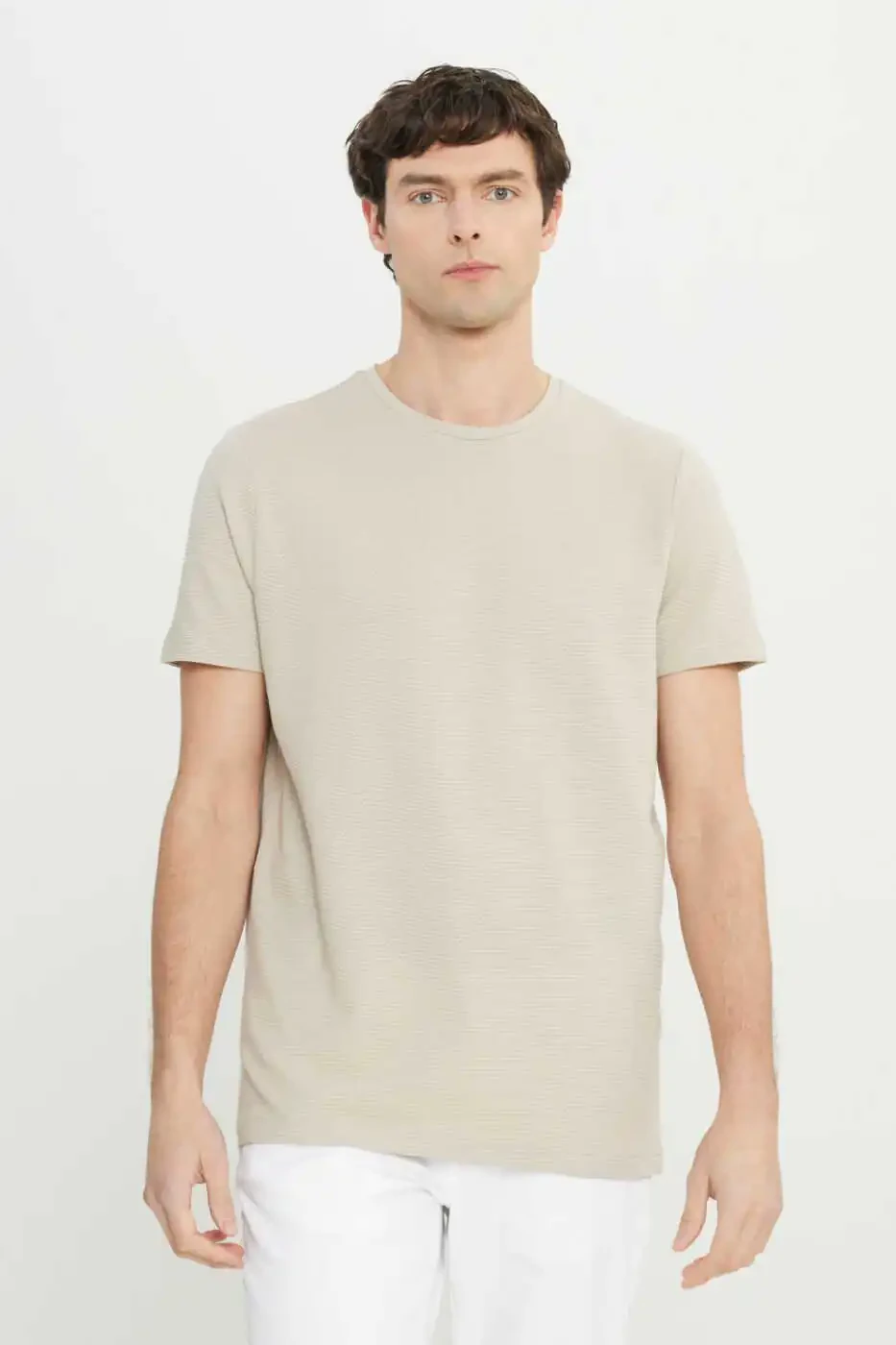 Bring your style to summer with the Men's Beige Cotton Slim Fit Narrow Cut Crew Neck Flexible T-Shirt! This t-shirt is a candidate to be an indispensable part of your wardrobe by combining modern and stylish looks. While the slim fit cut fits your body and provides a fit look, its flexible structure allows you to move comfortably throughout the day. The crew neck design adds a different touch to the t-shirt, allowing you to use it easily in both sports and daily combinations. The beige color provides ease of combination by easily matching with all kinds of clothes. You can create different styles by combining it with shorts, jeans or canvas pants. The cotton fabric, which will keep you cool and comfortable on hot summer days, allows your skin to breathe and minimizes sweating. While offering a soft touch thanks to its 75% cotton content, the 23% polyester and 2% elastane blend increases the durability of the t-shirt and ensures that it lasts longer. Offering a simple and stylish look with its pocketless design, this t-shirt will be the most loved piece of your summer collection. This special design t-shirt offered by DEMİRCANLAR is an ideal choice for men looking for quality and style together. The size on the mannequin is L, and the mannequin's measurements are 1.89cm height and 80kg weight. This information will give you an idea of how the t-shirt will look on you. Add this t-shirt with product code ACE091252299BEJ to your cart now and start reflecting your style. Remember, you can order a maximum of 10 of this product. This limit does not apply to corporate orders, and different limits are set for corporate orders. In addition, if you do not like the product, you can return it free of charge within 15 days. You can visit the relevant page for detailed information. AC Sports Cotton Slim Fit Narrow Cut Crew Neck Flexible T-Shirt will be an indispensable part of your wardrobe by offering style and comfort together.
