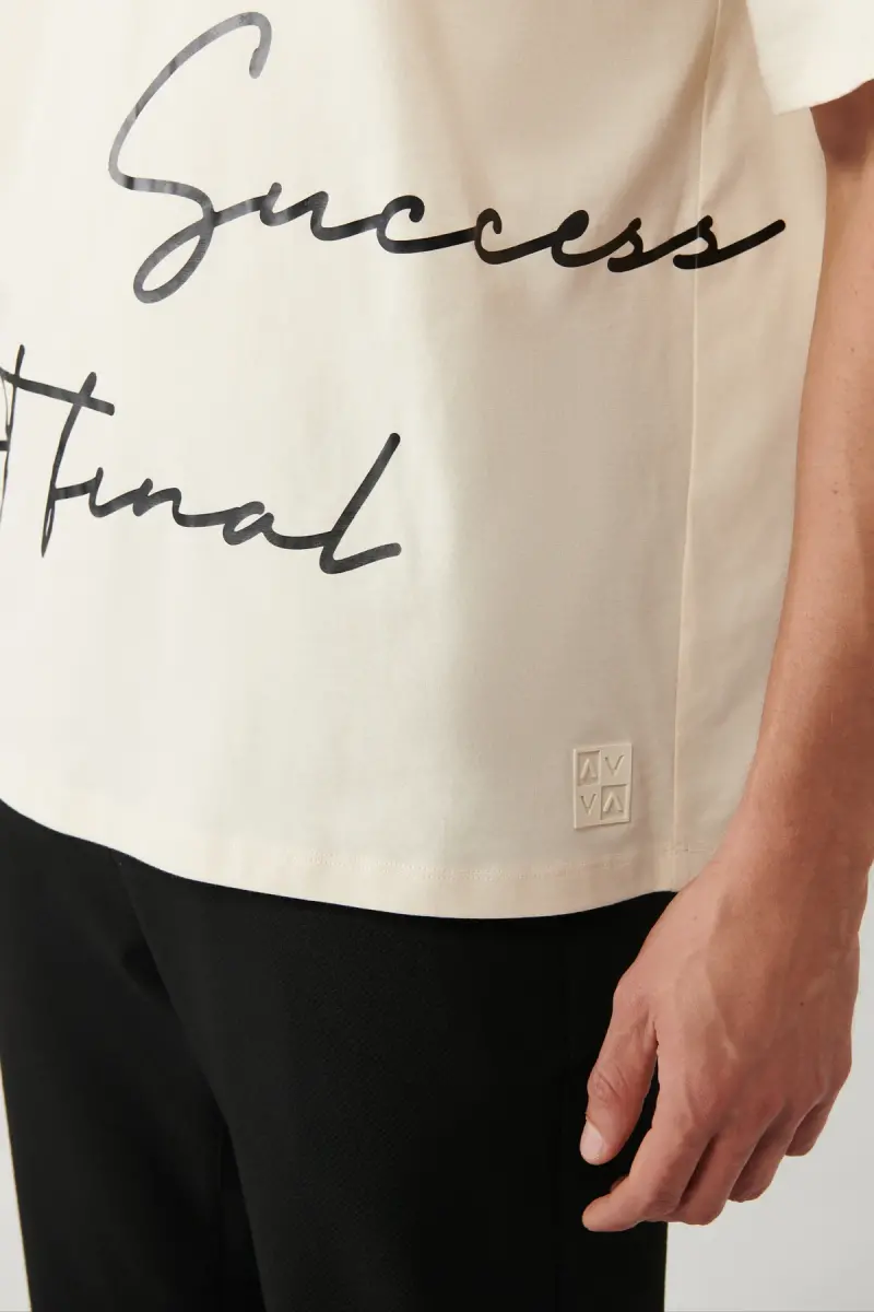 Add a modern touch to your everyday style! This beige crew neck oversized T-shirt with its unique print is sure to turn heads. Combining comfort and style, this T-shirt will perfectly complement your jeans, shorts, or dress pants.
