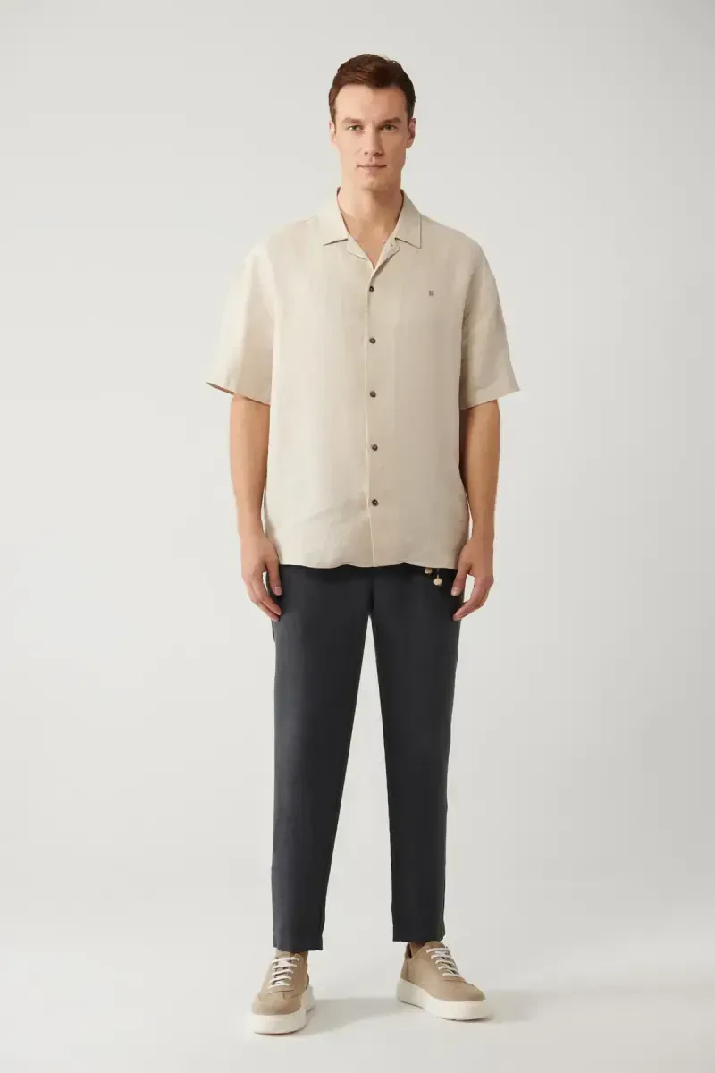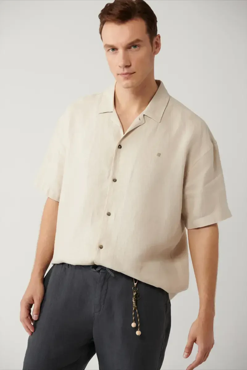 The perfect choice for those seeking both style and comfort in hot weather, the Men's Beige Shirt offers breathability and coolness with its 100% linen construction. The apaj collar detail adds a modern and stylish look, while the oversize fit provides a sense of comfort and freedom. The short sleeve design helps you stay cool on hot days. The soft texture of natural linen fabric provides a comfortable wearing experience throughout the day.