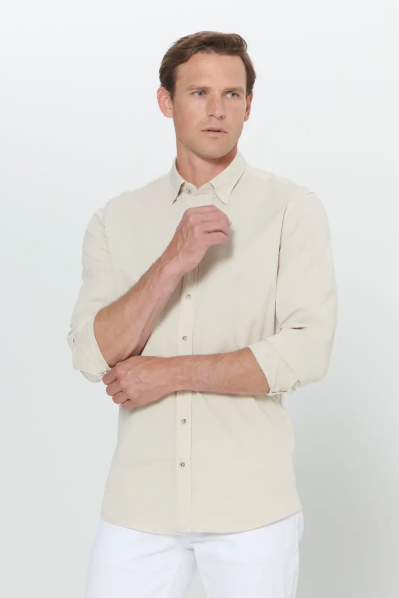 The Men's Beige Slim Fit Narrow Cut Hidden Button Collar Cotton Shirt offered by Altınyıldız Classics is a candidate to be one of the indispensable pieces of the modern man's wardrobe. With its slim fit cut, it perfectly emphasizes your body lines, while its narrow cut style allows you to achieve a dynamic and stylish look. The warm and natural tone of beige offers versatile use by harmonizing with all kinds of combinations. The hidden button collar detail of the shirt adds a sophisticated touch while helping you create a simple and elegant style. This special design is a timeless piece appealing to men of all age groups. Its woven fabric structure increases the durability of the shirt, while its cotton content offers breathability and comfort all day long. Suitable for long-term use, this shirt maintains its form even after washing and preserves its place in your wardrobe for many years. Whether in daily use, at special invitations, or in the workplace, you can easily prefer this shirt and highlight your elegance in any environment. Thanks to the standard size option, it adapts to different body types and has a cut that everyone can wear comfortably. This shirt stands out not only for its elegance but also for the comfort it offers. The soft texture of the cotton fabric gently touches your skin, allowing you to feel comfortable throughout the day. The hidden button detail creates a modern and minimalist look on the collar of the shirt, and it can also be easily combined with accessories such as ties or bow ties. The beige color, which can easily harmonize with other pieces in your wardrobe, allows you to reflect your style by combining it with jackets, trousers, and shoes in different colors and patterns. Produced with the quality of Altınyıldız Classics, this shirt is an ideal choice for men who want to have style and do not want to compromise on comfort. Thanks to its slim fit cut, it offers a fit appearance with its structure that fits the body. You can create a casual style by combining it with jeans in daily use, or you can achieve a more formal look by combining it with classic cut trousers. This shirt, which will allow you to reflect your elegance and style in any situation, is a candidate to be one of the most popular pieces in your wardrobe.