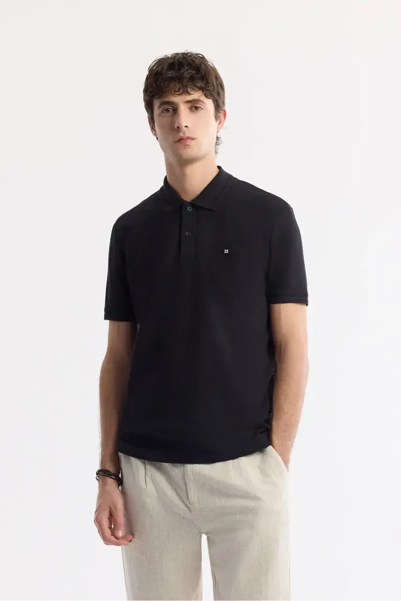 The Men's Black 100% Cotton Quick Dry Regular Fit Non-Wrinkle Polo Collar T-shirt adds style and comfort to your everyday look. Made from high-quality cotton fabric, it offers breathability and a soft feel. Its quick-drying feature makes it an ideal choice for sports activities or casual wear. The regular fit cut provides a perfect fit for your body and allows you to move comfortably. The non-wrinkle feature ensures that it maintains its perfect appearance even after prolonged use. The polo collar design offers a stylish and modern look, while also having a classic style. The black color can be easily combined with any trousers or shorts, allowing you to create different styles.
