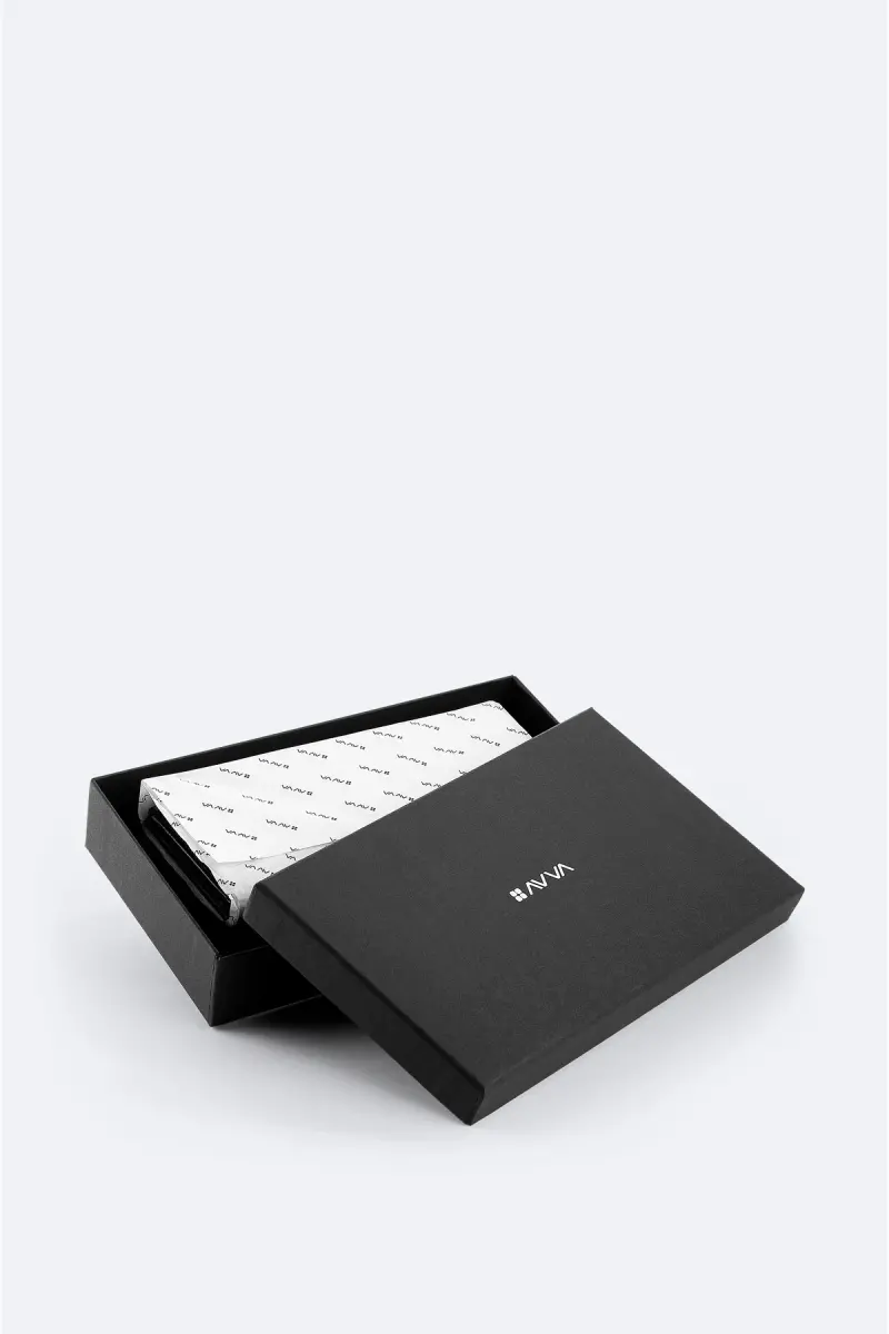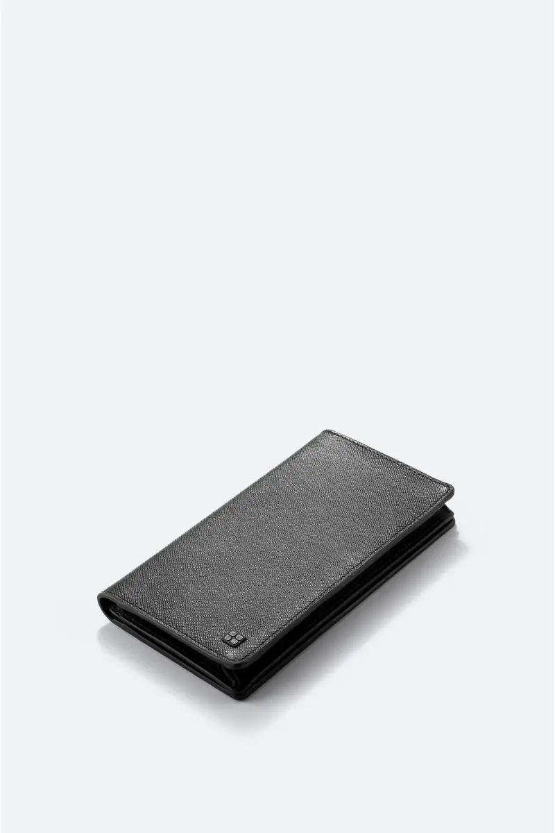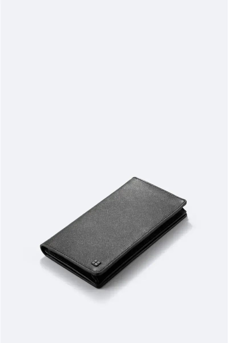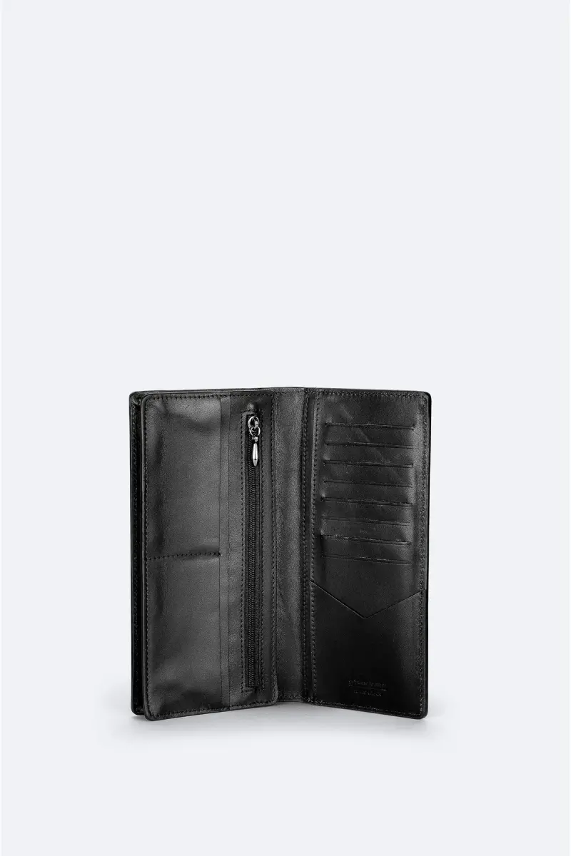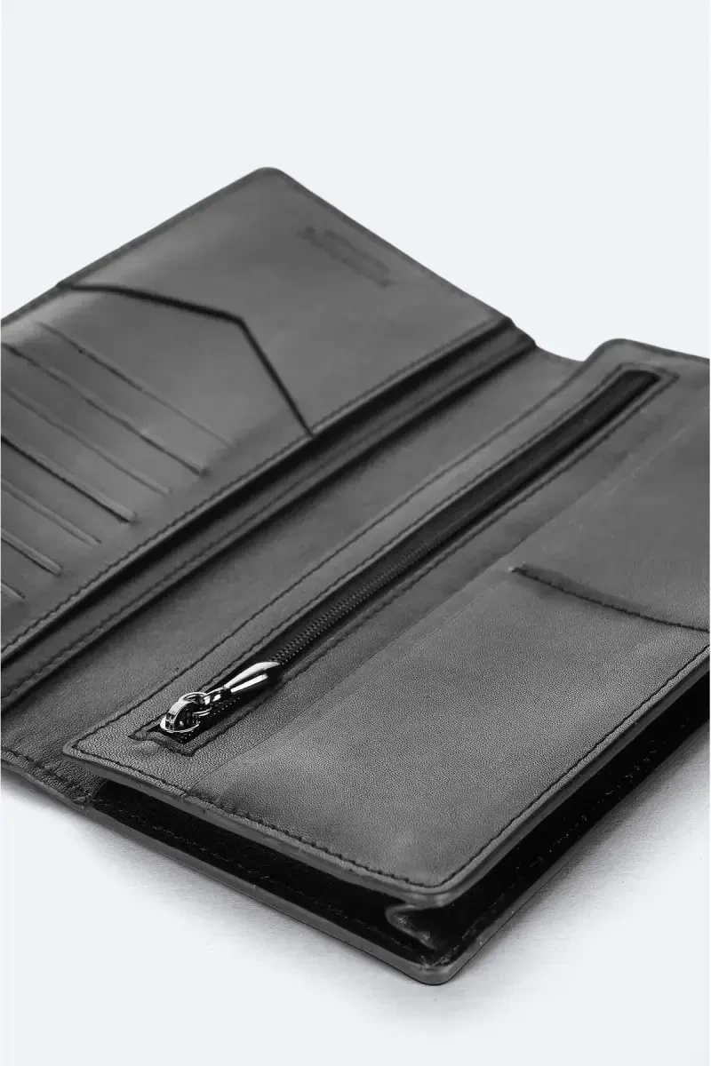 Main compartment with pocket for banknotes, nine compartments on one side, zippered compartment on the other side and four card slots. 100% Leather Wallet