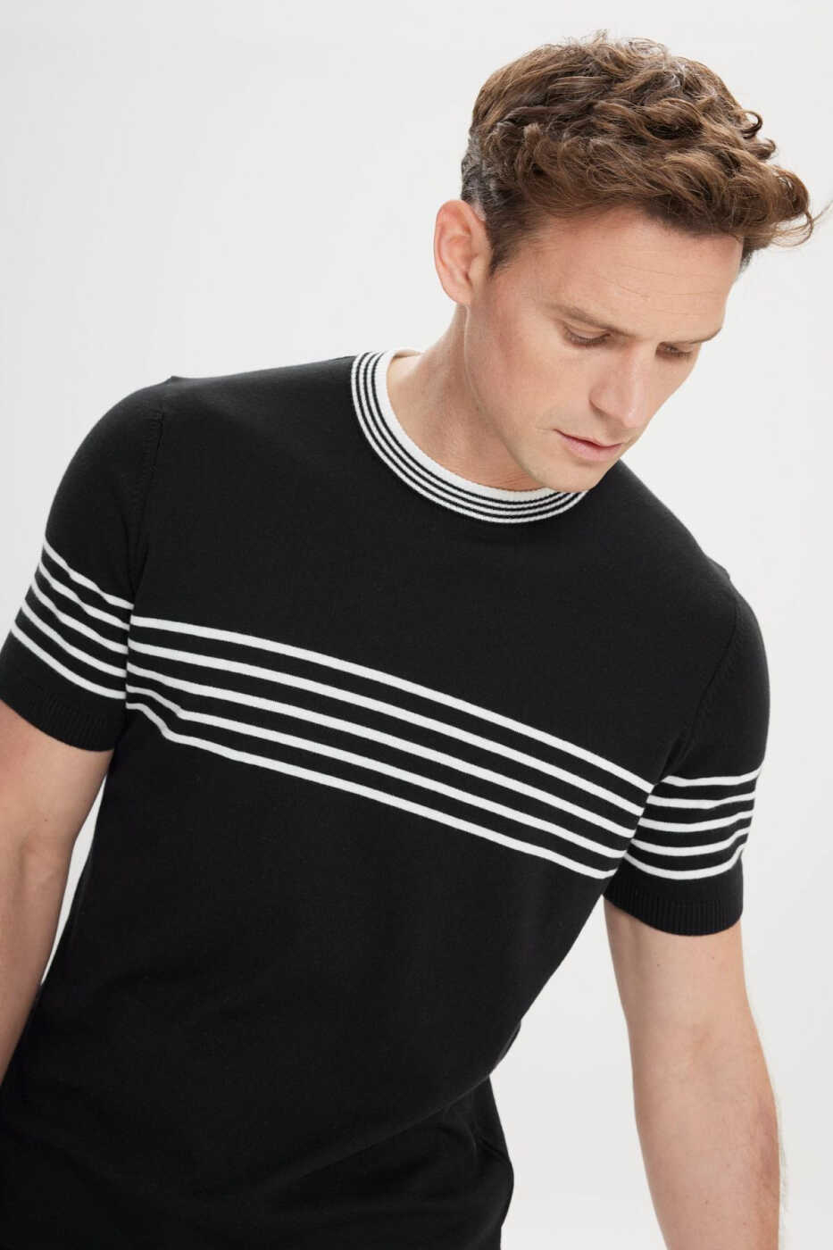 Men's Black-White Standard Fit Regular Fit 100% Cotton Striped Crew Neck Knitted T-Shirt is an ideal choice for men who do not want to compromise on their style on hot summer days. This T-shirt is a candidate to be an indispensable part of your wardrobe by combining both comfort and modern design. Thanks to its 100% cotton content, it offers a breathable and comfortable use throughout the day. It provides a soft touch to your skin and helps you stay fresh all day long by minimizing sweating. The timeless harmony of black and white creates a dynamic look by being enlivened with a striped pattern. In this way, you can easily prefer it both in your daily activities and in more special moments. The standard fit cut offers a comfortable silhouette that does not fit the body tightly. This cut allows you to achieve a stylish look without restricting your freedom of movement. The normal fit feature aims to make everyone comfortable by easily adapting to different body types. The crew neck detail adds a modern and sporty touch to the T-shirt, while the short-sleeved design is an ideal solution against the heat of summer months. Produced with ACCo/Altınyıldız Classics quality, this knitted T-shirt offers a long-lasting and durable use. Thanks to its quality material and workmanship, you will not encounter problems such as shrinkage or fading after washing. The dimensions of the mannequin in size L (Height: 1.89cm, Weight: 80kg) can help you with size selection. If you are looking for both a stylish and comfortable alternative in your wardrobe, this striped knitted T-shirt is just for you. You can create different styles by combining it with jeans or shorts. This T-shirt will be one of the most popular pieces of your summer collection. The product code is ET4924200001SYB. You can easily find and order the product with this code. Feel good in any environment with this T-shirt that offers style and comfort together.