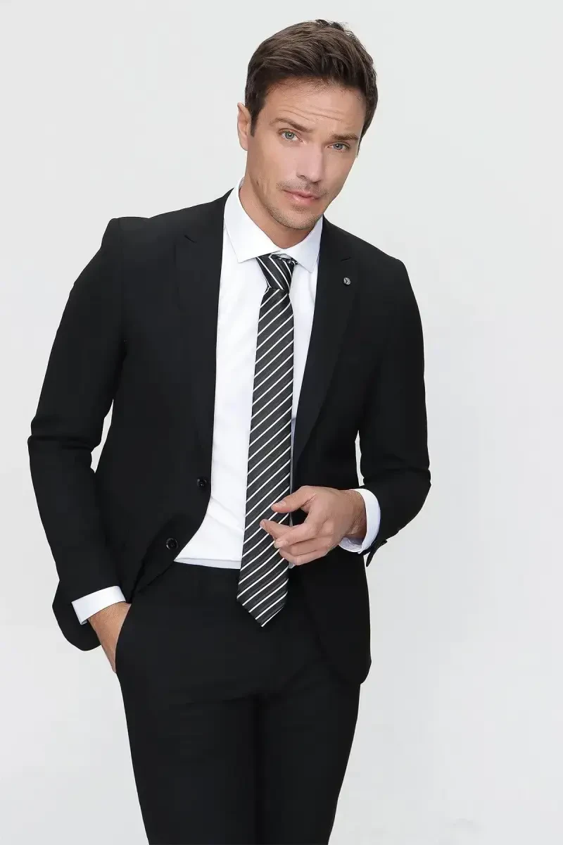 Men's Black Basic Plain Slim Fit Narrow Cut 6 Drop Suit is a timeless piece that every modern man should have in his wardrobe. Whether you want to display a professional look in business life or show off your elegance at special events, this suit offers you a flawless style in any environment. One of the most distinctive features of the suit is its slim fit cut, which fits the body but provides comfortable use without restricting your freedom of movement. This cut makes your silhouette more pronounced, creating a modern and dynamic look. The quality of the fabric supports the stylish appearance of the suit and ensures its long life. The breathable structure of the fabric offers comfortable use throughout the day, while its wrinkle-resistant feature helps you look well-groomed at all times. The plain black color of the suit creates a classic and sophisticated atmosphere, while also offering the advantage of being easily combined with shirts in different colors and patterns. Whether you catch a timeless elegance with a white shirt or add a different dimension to your style with a shirt in vibrant colors, this suit will suit any combination. You are also free in choosing accessories. You can complete your suit with a stylish tie and handkerchief, or you can choose only a pocket watch or stylish cufflinks for a more minimalist look. The 6 drop pattern allows you to achieve the most suitable look for your body type by ideally adjusting the ratio between the jacket and trousers of the suit. This pattern offers a perfect fit, especially for men with wider shoulders and chest. While the jacket attracts attention with its classic collar cut and button details, the trousers offer a modern look with its straight leg cut. Every detail of the suit has been carefully designed and produced using quality materials. The straightness of the seams, the robustness of the buttons and the texture of the fabric reveal the quality of the suit at first glance. This suit is not just a piece of clothing, but also a style statement. It is an investment that will make you feel confident and stylish, and will attract attention in any environment.
