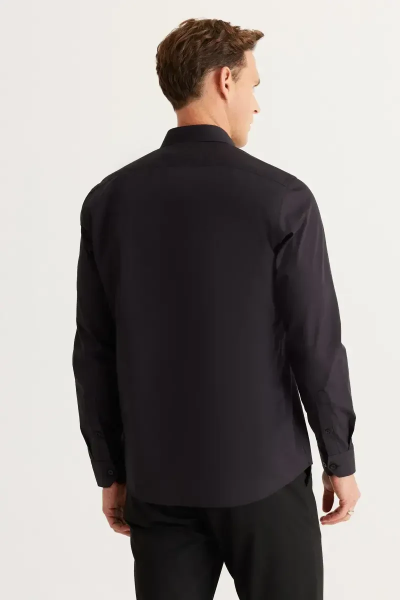 Men's Black Easy Iron Non-Iron Slim Fit Narrow Cut Classic Collar Cotton Shirt is a timeless piece that should be in the modern man's wardrobe, saving you time, and combining elegance and practicality. Thanks to its special wrinkle-resistant fabric, it looks ironed all day long. Its slim fit cut creates an elegant silhouette that fits the body, while its narrow cut adds a dynamic feel. The classic collar detail is suitable for both formal and casual use. High-quality cotton fabric offers breathability and comfort. The black color can be easily combined with any style. Whether you make a stylish combination with a suit or create a comfortable style with your daily clothes. This shirt will add confidence and elegance to you. It is an ideal choice for men who want to look well-groomed at all times without the hassle of ironing. Reflect your style both in your business life and on your special days.