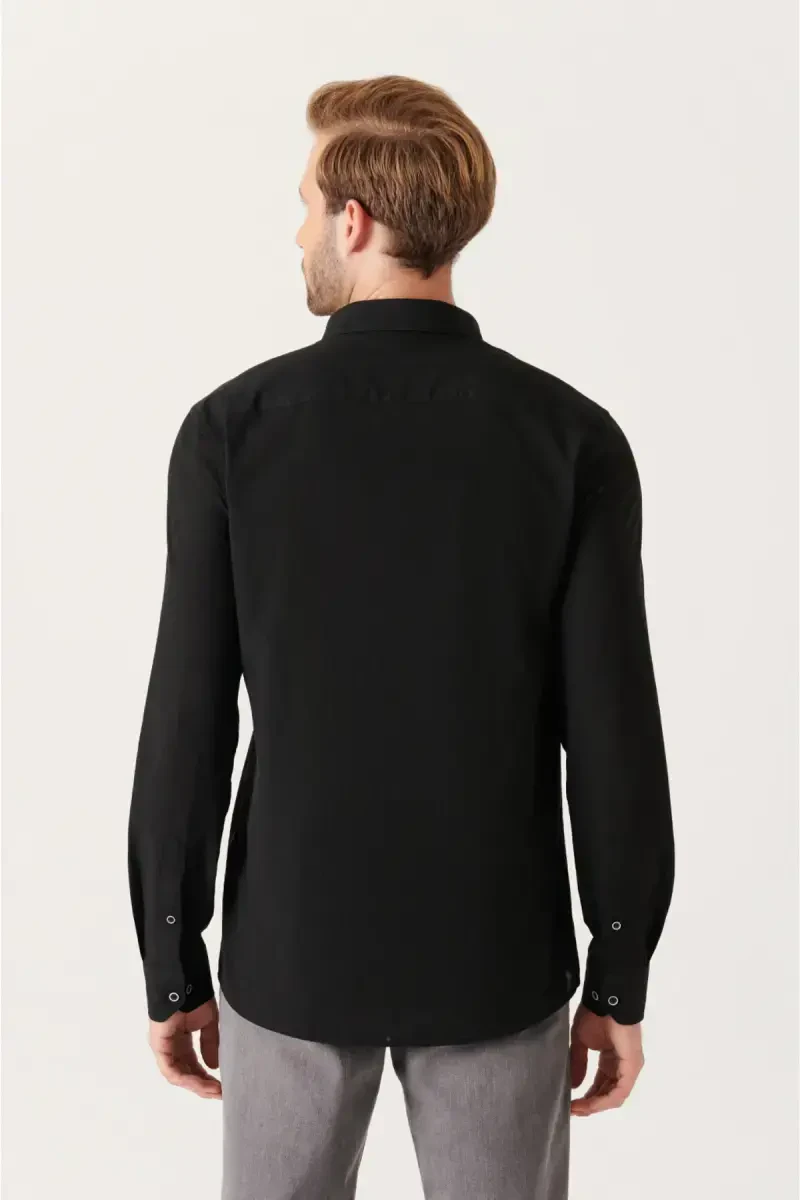 The perfect choice to complete your everyday style, the Men's Black Shirt offers superior comfort with its 100% cotton fabric. Its fine and soft texture leaves a silky feeling on your skin, while its buttoned collar and long sleeves ensure you look stylish in any environment. The regular fit cut provides freedom of movement, allowing you to enjoy a comfortable wearing experience all day long.