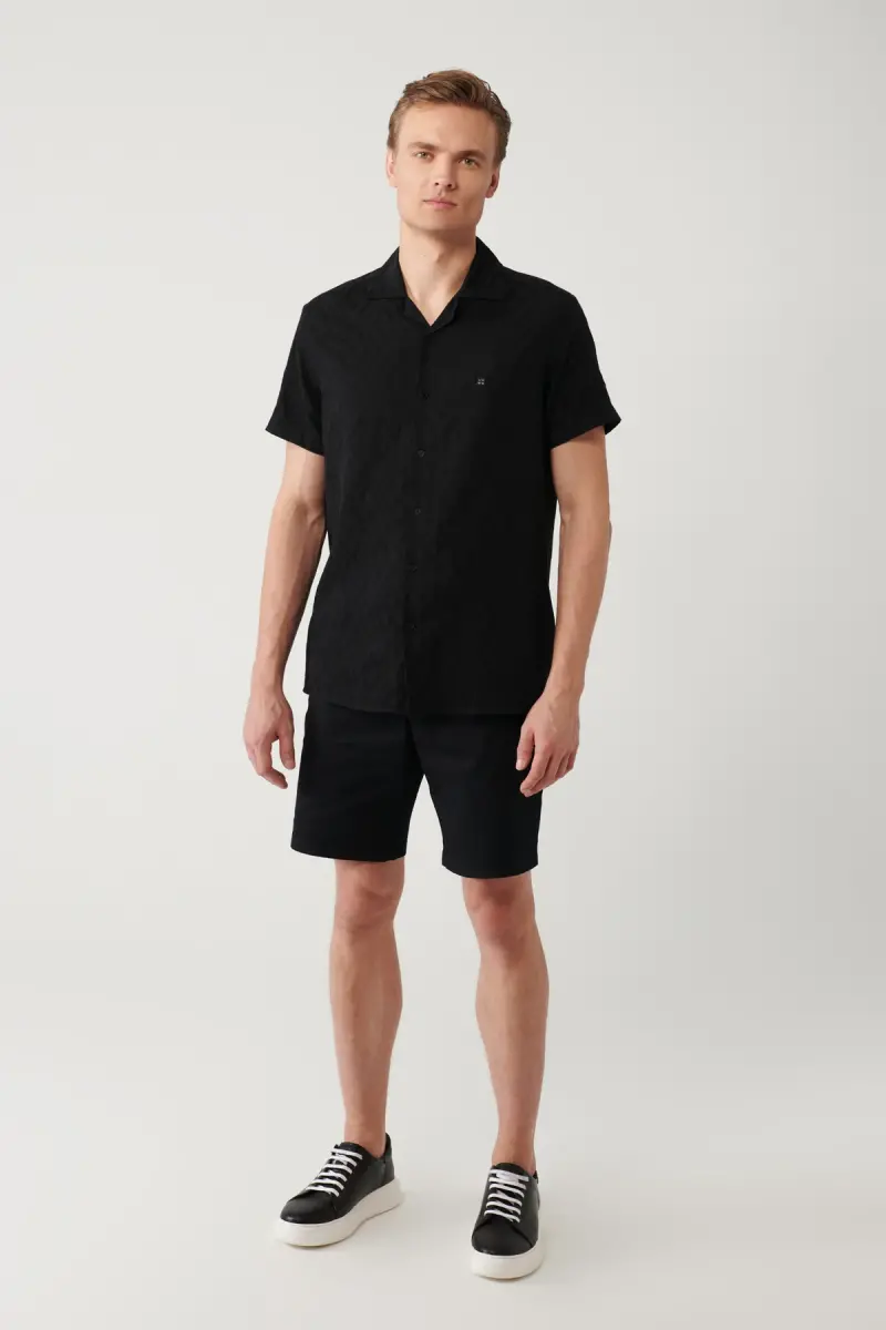 Designed to add a sophisticated touch to your everyday style, the Men's Black Shirt offers a modern look with its Apaj collar detail. Its short sleeves and comfortable cut, combined with its jacquard textured fabric, create a stylish yet comfortable look.