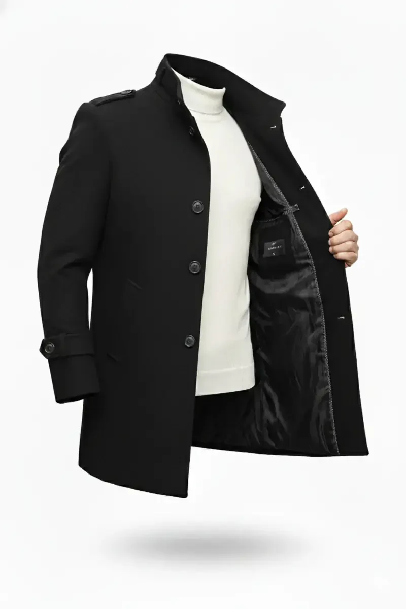 men's peacoat, black peacoat, slim fit peacoat, stand collar peacoat, long peacoat, wool peacoat, winter peacoat, stylish peacoat, modern peacoat