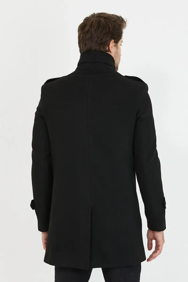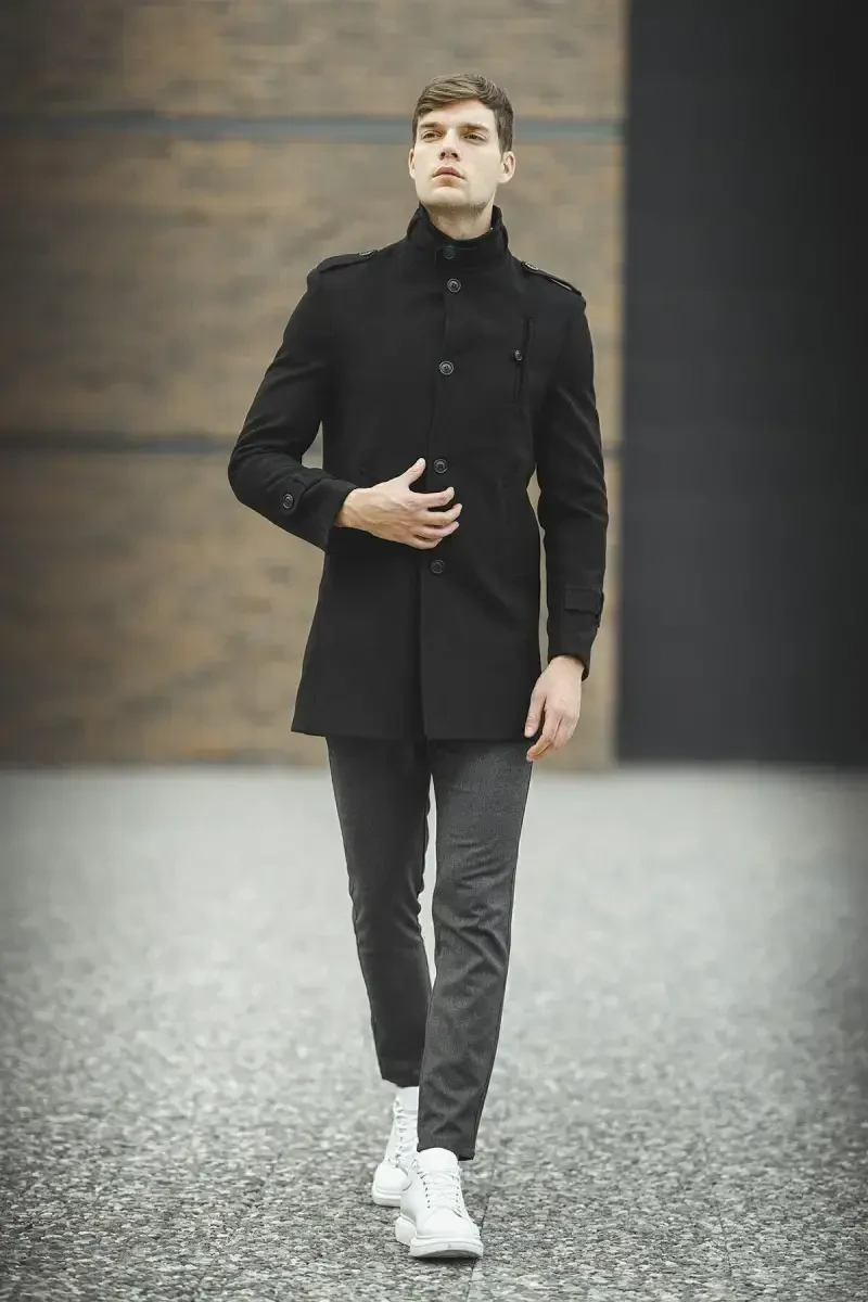 Combining style and warmth, the men's black slim fit stand collar long wool blend peacoat is the perfect choice to complete your style in the winter months. With its elegant and modern design, this coat will adapt to any environment and is made of high-quality materials that will last for years to come.