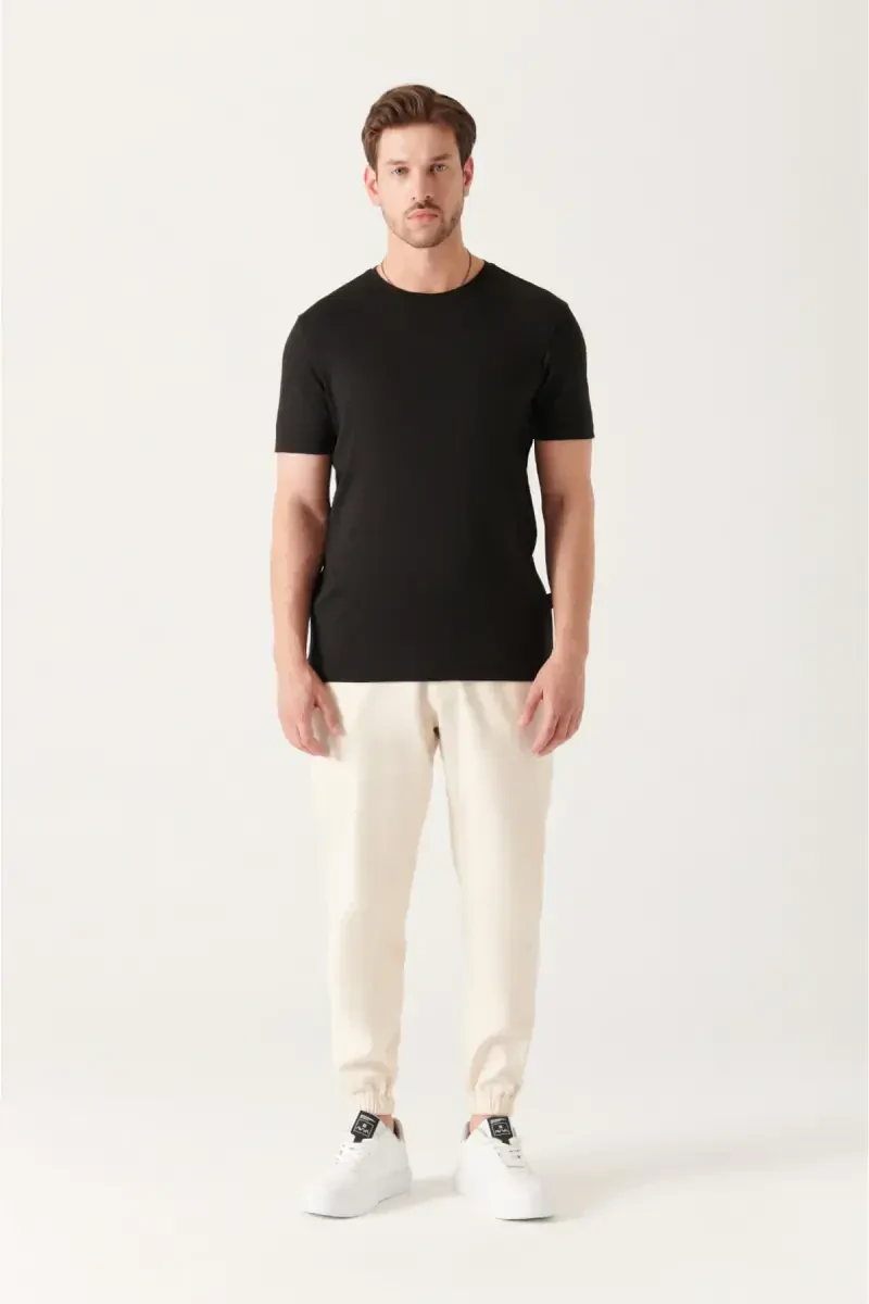 Men's Black Soft Touch Crew Neck Plain Modal T-Shirt, a candidate to be an indispensable part of your wardrobe with AVVA quality! This stylish and comfortable t-shirt reflects the style of the modern man while offering comfort all day long. The crew neck design adds a different touch to the t-shirt, while the plain black color is compatible with all kinds of combinations. You can combine it with jeans for daily use or with a blazer jacket for a more stylish look. This t-shirt, carefully prepared by AVVA, has a soft touch thanks to its 50% modal and 50% cotton blend fabric. The breathable structure of the modal fabric prevents sweating throughout the day and keeps your skin cool. Cotton increases the durability of the t-shirt and offers long-lasting use. Thanks to the soft touch feature, you will feel the comfort the moment you put on the t-shirt. The regular fit cut fits the body perfectly without restricting your freedom of movement. The AVVA logo embroidery detail on the chest adds an elegant touch to the t-shirt. This detail reflects the quality and style of the brand. Moreover, this t-shirt does not leave marks and can be ironed easily. In this way, it ensures that you always look well-groomed and stylish. AVVA Men's Black Soft Touch Crew Neck Plain Modal T-Shirt is not only stylish but also a practical choice. This t-shirt, which will accompany you both in daily use and on special occasions, will be an indispensable part of your wardrobe. Do not miss this product offered with AVVA assurance, bring your style and comfort together! Colors may vary due to light differences in studio shots. Model Height: 185 cm. Chest: 100 cm. Waist: 79 cm. Hips: 99 cm. Sample Size: M