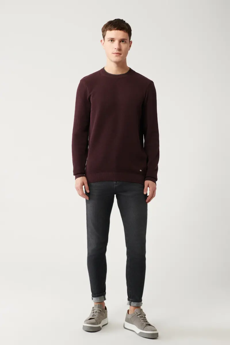 Combining style and comfort, the Men's Burgundy Knit Sweater will be an indispensable part of your wardrobe. Featuring a double collar and textured fabric, this sweater is a perfect choice for any combination.