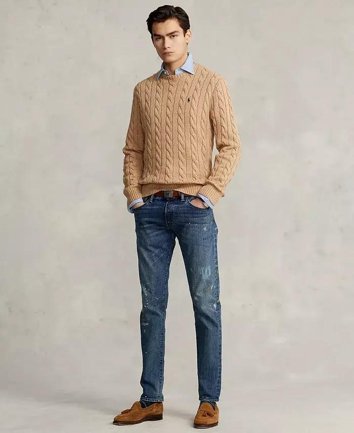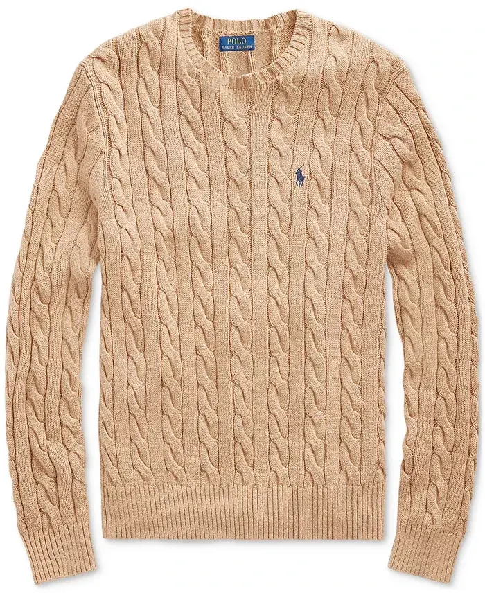 Polo Ralph Lauren's cotton sweater combines two of Polo's most iconic design details: a textural cable-knit motif and our signature Pony. Approx. model height is 6'1" and he is wearing a size medium Size medium is approx. 26-½" long Regular fit: wider at the chest while still maintaining a modern silhouette Crewneck; pullover Long sleeves with rib-knit cuffs Rib-knit hem Signature embroidered Pony at the left chest 100% cotton Machine wash Imported