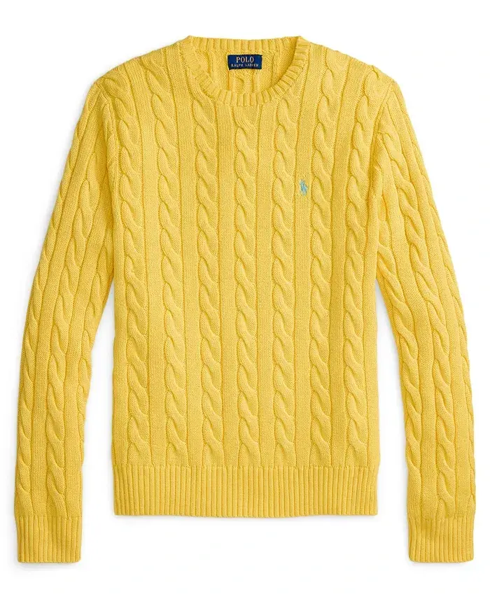 Polo Ralph Lauren's cotton sweater combines two of Polo's most iconic design details: a textural cable-knit motif and our signature Pony. Approx. model height is 6'1" and he is wearing a size medium Size medium is approx. 26-½" long Regular fit: wider at the chest while still maintaining a modern silhouette Crewneck; pullover Long sleeves with rib-knit cuffs Rib-knit hem Signature embroidered Pony at the left chest 100% cotton Machine wash Imported