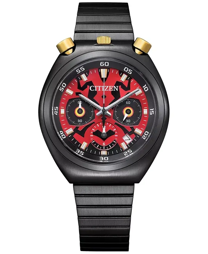 Embrace the dark side and express your style with this unique Citizen chronograph watch that embodies the spirit of Darth Maul, one of the most iconic figures in the Star Wars universe. The Men's Chronograph Star Wars Darth Maul Black-Tone Stainless Steel Bracelet Watch is not just a timepiece, but a collector's item for Star Wars enthusiasts. With its masterful use of red, black, and yellow details, this watch brings Darth Maul's menacing and striking look to your wrist. Whether for everyday use or a special event, this watch will draw attention and allow you to proudly display your Star Wars fandom.The 38mm case diameter makes the watch an ideal size for both men and women who prefer larger watches. The spherical mineral crystal glass protects the watch's dial from scratches and impacts while providing excellent readability. The Star Wars logo engraved on the case back emphasizes that this watch belongs to the Star Wars collection.The black-tone stainless steel bracelet gives the watch a stylish and modern look while offering durability and long-lasting use. The sliding buckle mechanism allows the bracelet to be easily adjusted and fits perfectly on any wrist.The Darth Maul-themed chronograph dial is one of the watch's most striking features. The red second hand, yellow details, and black background reflect Darth Maul's color palette, while the chronograph functions offer precise time measurement. In addition, the date window on the dial provides a practical feature to simplify your daily life.This watch is not only a stylish accessory but also a product of Citizen's superior watchmaking technology. The three-hand quartz movement ensures the watch operates accurately and reliably, while the water resistance up to 50 meters provides protection against water splashes and short-term exposure to water that you may encounter in daily use.With this purchase from Modazone stores, you can take advantage of the free watch adjustment service to ensure your watch fits your wrist perfectly. You can also register for the Modazone WorryNoMore® Jewelry & Watch Protection program to secure your watch and protect it against potential damage.This unique Star Wars watch is not just a timepiece, but a form of expression, a display of passion, and an unforgettable gift option. Embrace the dark side and carry Darth Maul's legacy on your wrist with this unique watch.
