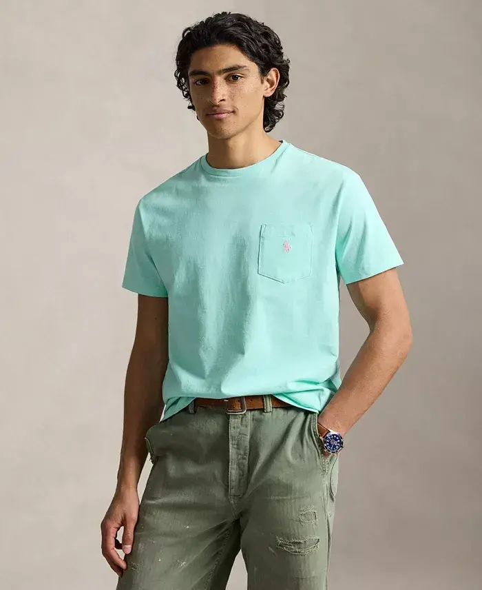 Washed for a soft feel, this jersey T-shirt from Polo Ralph Lauren is an off-duty essential you'll reach for again and again. Size medium has an approx. 28-1/2" front body length Classic fit: Polo Ralph Lauren's roomiest silhouette Crewneck; pullover closure Cut for a lower armhole and a fuller sleeve that falls closer to the elbow Also available in Active Fit (approx. 1" trimmer at the chest and 1" shorter at the body) and Custom Slim Fit (approx. 2-1/2" trimmer at the chest and 1" shorter at the body) Short sleeves Signature embroidered pony at the left chest patch pocket 100% cotton Machine wash Imported
