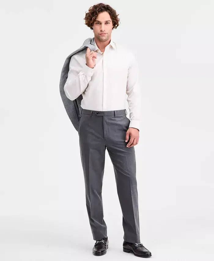 Designed with your on-the-go life in mind, these classic fit Michael Kors pants check all the proverbial boxes. Classic fit pants sit at the waist; relaxed fit through hips and thighs with a straight leg opening Zip fly with button and hook closure Two side hand pockets; two back welt pockets Finished hem 67% polyester, 29% viscose, 4% spandex Dry clean Imported