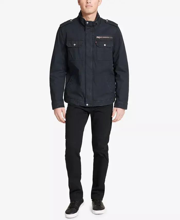 Levi's® uses both flap-close pockets and a zip-close pocket at the left chest to create the modern look of this cotton jacket, styled with a full zipper closure and a snap placket at the front. Approx. model height is 6'1" and he is wearing a size medium Mid-weight Stand collar Front zip closure with snap placket Cotton/polyester; lining: polyester Machine washable Imported