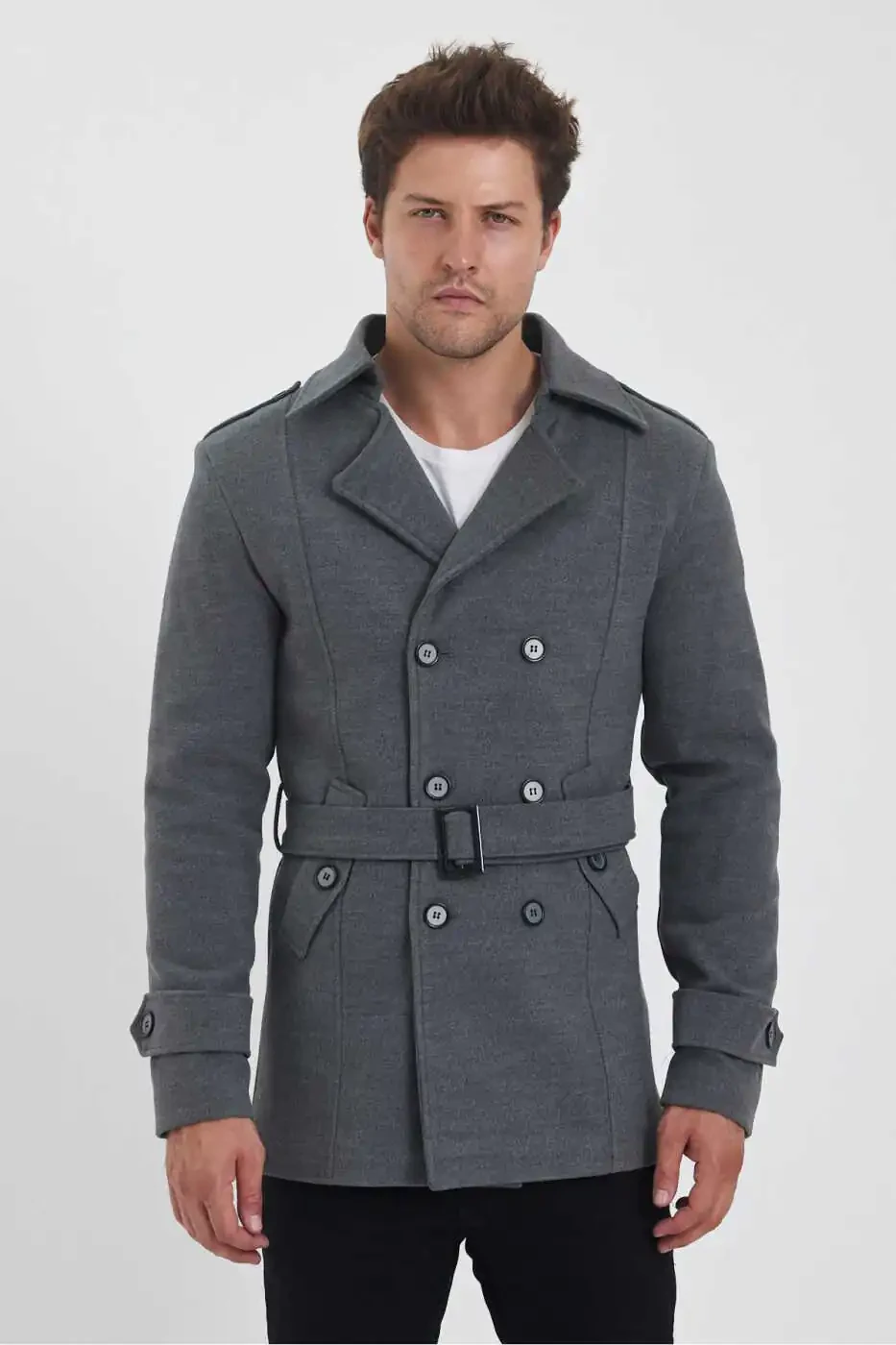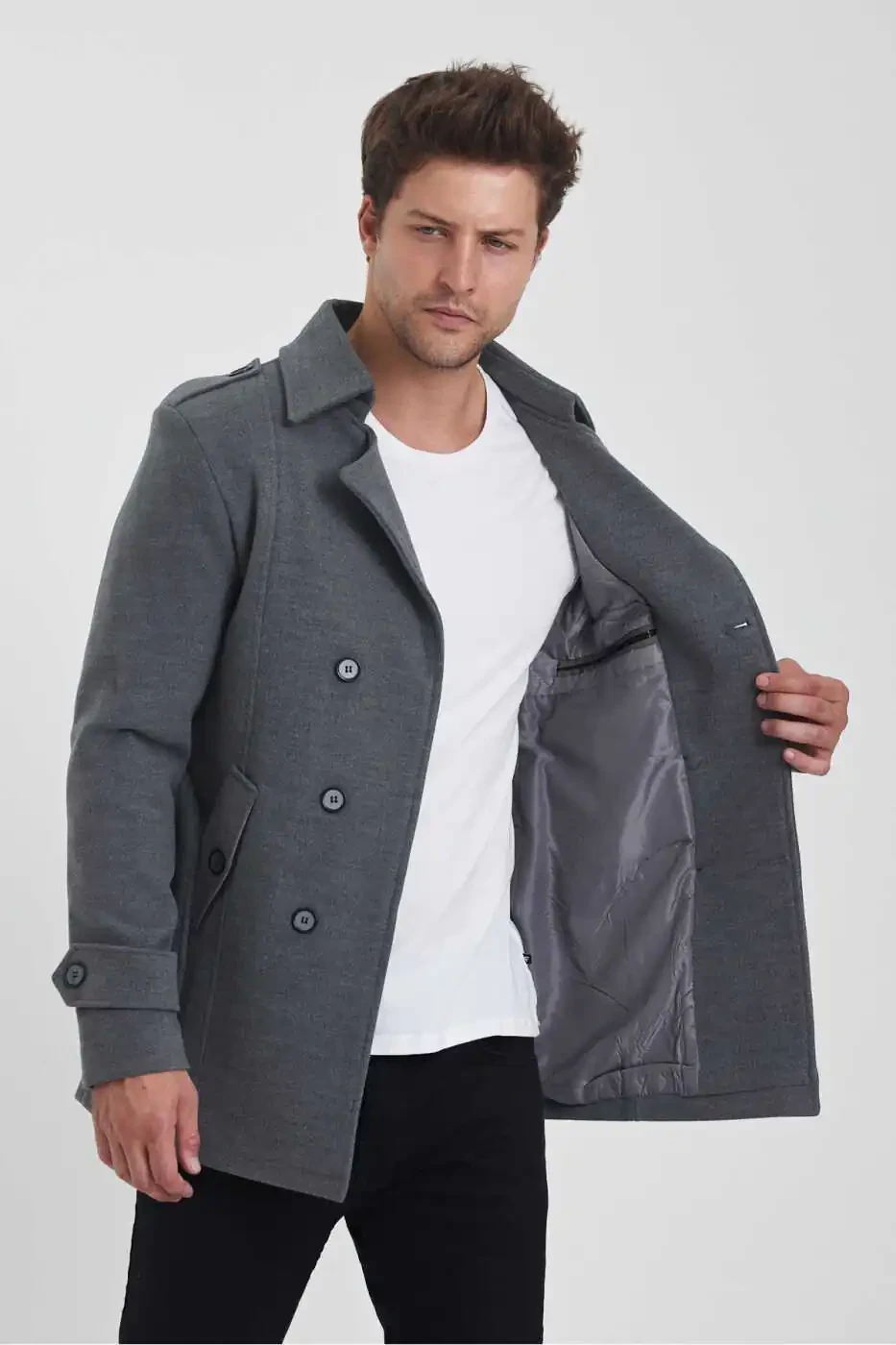 The men's grey double-breasted slim fit peacoat is a practical option for everyday use. You can choose it for job interviews, special occasions, or whenever you want to achieve a stylish look in everyday life.