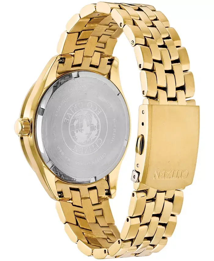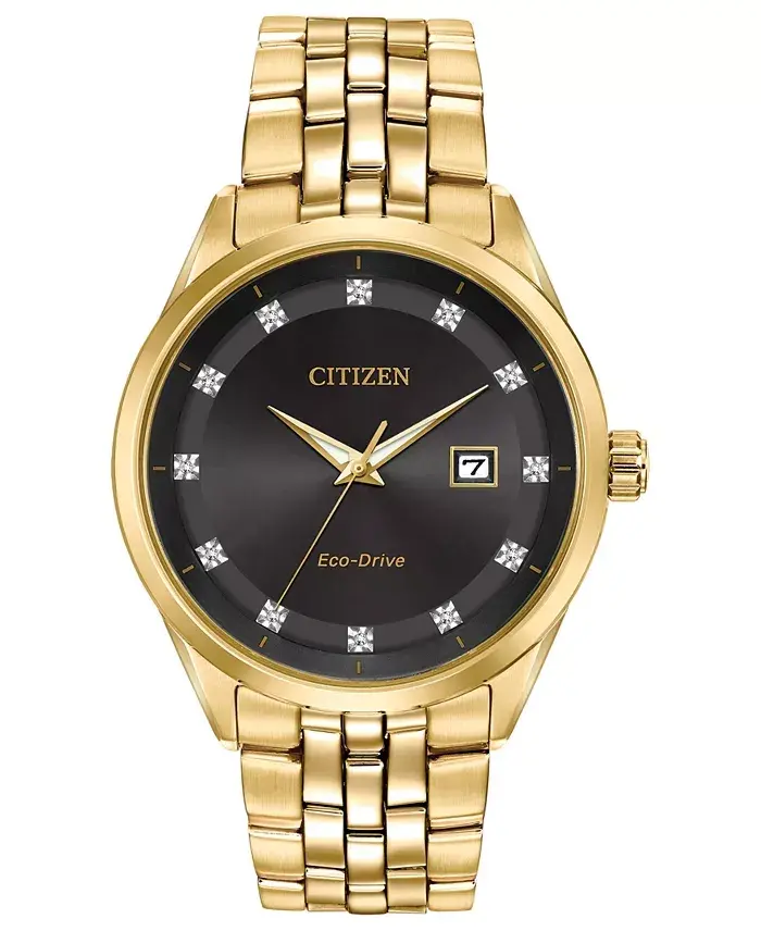 The Citizen Men's Eco-Drive Corso Diamond-Accent Gold-Tone Stainless Steel Bracelet Watch features a special design that combines elegance and environmental awareness. The gold-tone stainless steel case and bracelet give the watch a luxurious and durable look, while Eco-Drive technology powers it with solar energy, eliminating the need for battery changes. This allows you to make an environmentally conscious choice and ensures that your watch is always ready for use. The diamond details on the dial offer a sophisticated and elegant touch, while the classic design of the Corso series is a perfect match for any style. Whether for daily use or special occasions, this watch will always complement your style and attract attention. Produced with Citizen quality, this watch is an investment that you can use safely for many years. Thanks to its waterproof feature, it is resistant to the difficulties of daily use. This watch, which is the stylish and environmentally conscious choice of men, can also be a meaningful and valuable gift option for your loved ones. Experience timeless elegance and technology together with Citizen Eco-Drive Corso.