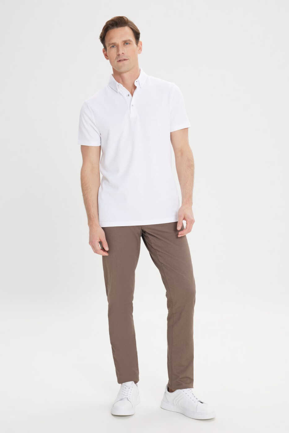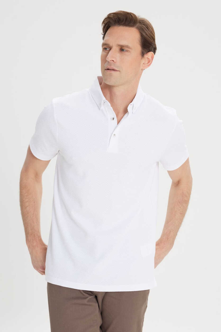 Altınyıldız Classics Limited Edition Slim Fit Tight Cut Cotton Jacquard Polo Collar T-Shirt has a special design that combines elegance and comfort. The fabric, produced from a blend of 60% cotton, 35% polyester and 5% elastane, provides all-day comfort with its breathability and flexibility. The ecru color and jacquard pattern give the t-shirt a classic and modern look. The slim fit has a body-hugging cut and creates a stylish silhouette. The polo collar detail adds a sophisticated touch to the product. This short-sleeved t-shirt, which belongs to the summer collection, is an ideal choice for hot weather. It perfectly matches jeans, chinos or shorts in daily use. You can achieve a stylish and comfortable look by combining it with sneakers or loafers. Offered with Altınyıldız quality and Trendyol assurance, this t-shirt will be one of the indispensable pieces of your wardrobe. The product on the model is size L, the model's height is 1.89 cm and weight is 80 kg. Product code: 4A4824200018EKR. This product will be shipped by Trendyol and stocks are limited to take advantage of the campaign price.