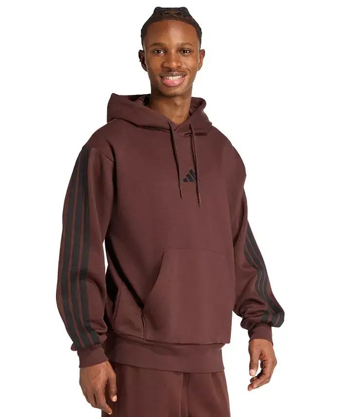 This cozy fleece hoodie from adidas offers a modern design for an easy, everyday look. This hooded sweatshirt features a new bold execution of the iconic three stripes and an embroidered three-bar logo. The updated fit, fabrics, and branding, along with a new two-piece hood construction, make this hoodie a versatile addition to any wardrobe. Regular fit Two-piece hood Drawstring Embroidered three-bar logo at front; front kangaroo pocket; drop shoulder construction; ribbed cuffs and hem; slightly short back length 55% cotton, 36% polyester, 9% viscose Machine wash Imported
