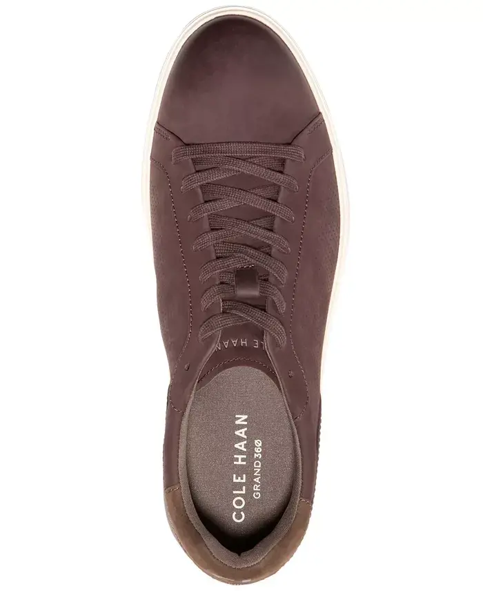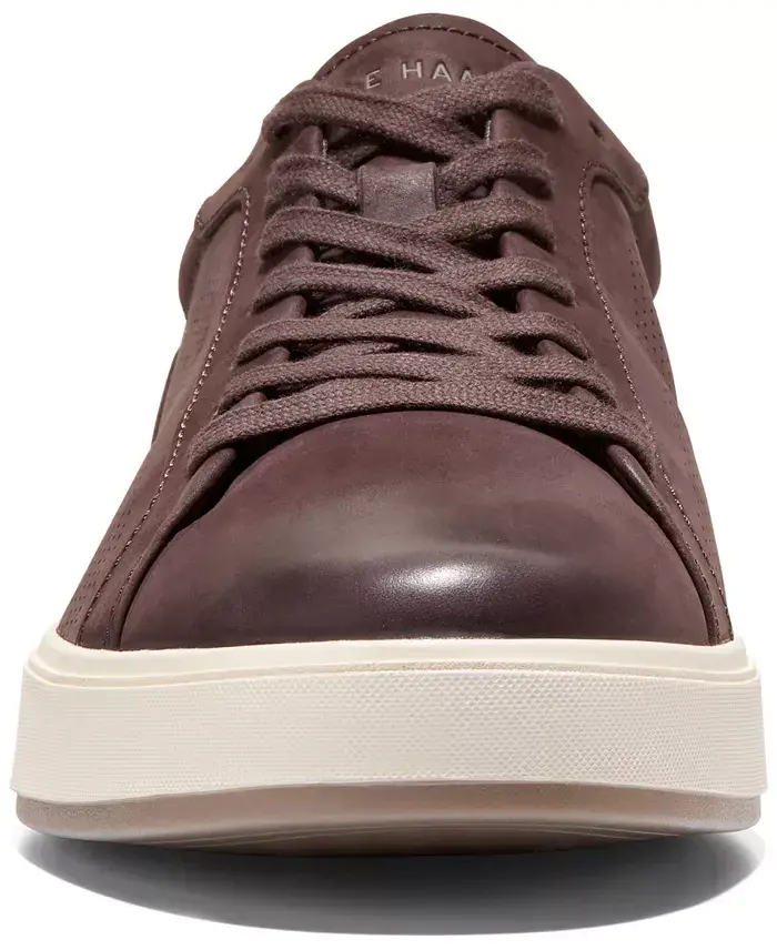 Cole Haan's GrandPrø Angleace Sneaker lends the best of both worlds: a minimalist design comprised of premium mixed materials and ultra-fine, laser-cut perforations. What's more is that this pair features GRANDFØAM™ cushioning and a durable rubber outsole for long-lasting comfort from 9-5 and 5-9. Round toe Lace-up Padded collar; GRANDFØAM™ cushioning; foam footbed Flexible and durable rubber sole Blind eyelets; brand detailing on sockliner, outsole, tongue Perforated leather or nubuck leather upper; polyester lining; rubber sole Imported