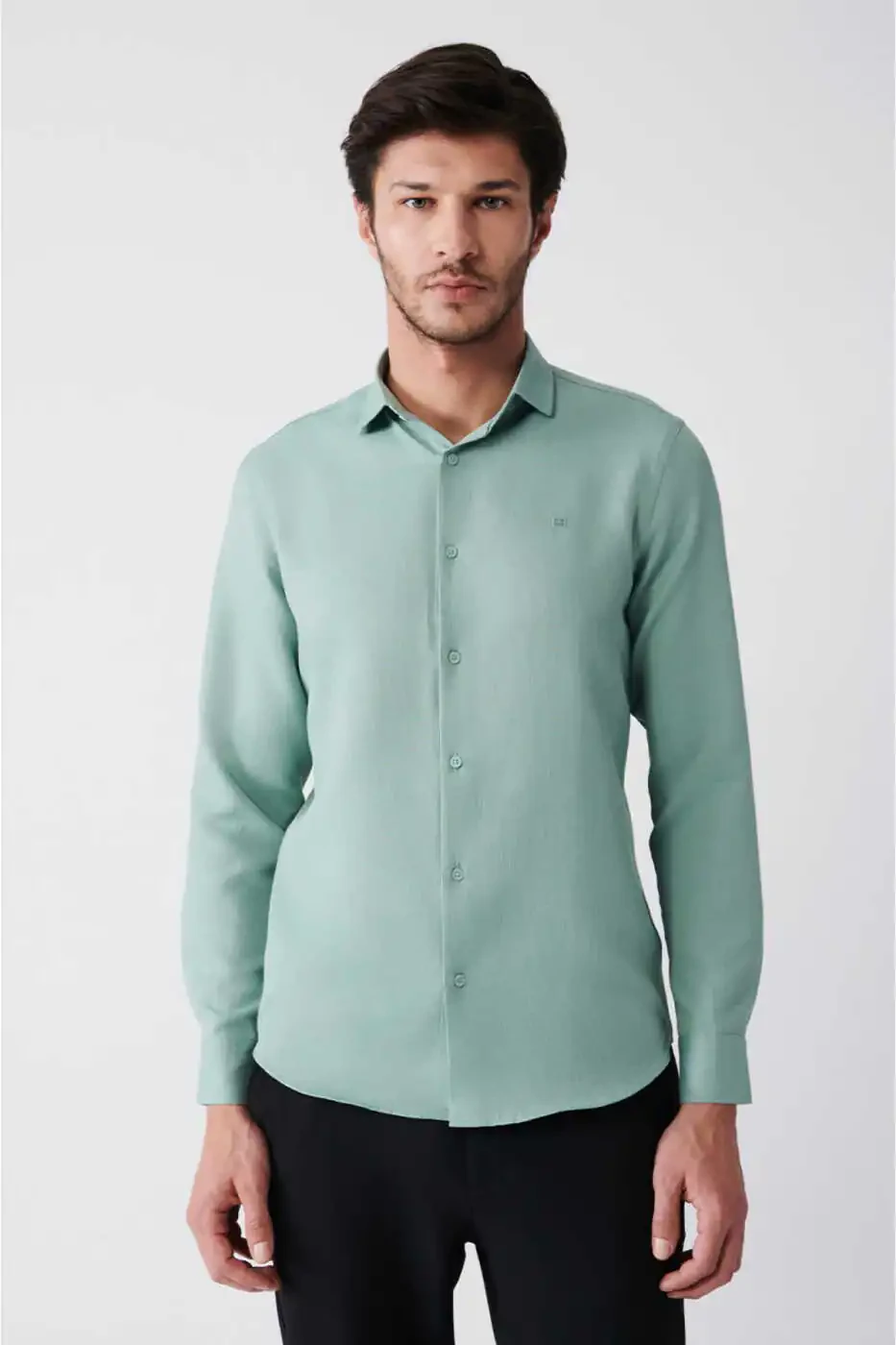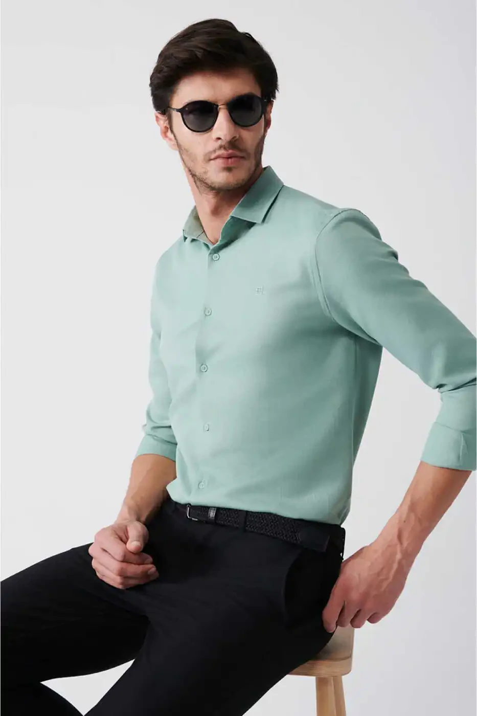 Complete your style with the Men's Green Easy Iron Classic Collar Goffered Cotton Slim Fit Narrow Cut Shirt E002030, combining style and comfort!