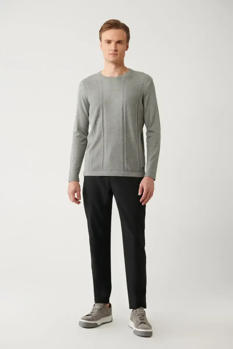 This stylish and comfortable grey knit sweater is a must-have for any man's wardrobe, adding a touch of sophistication to your everyday style. With its crew neck and cotton texture, the sweater provides a stylish and comfortable look, while its regular fit provides a perfect fit for your body.