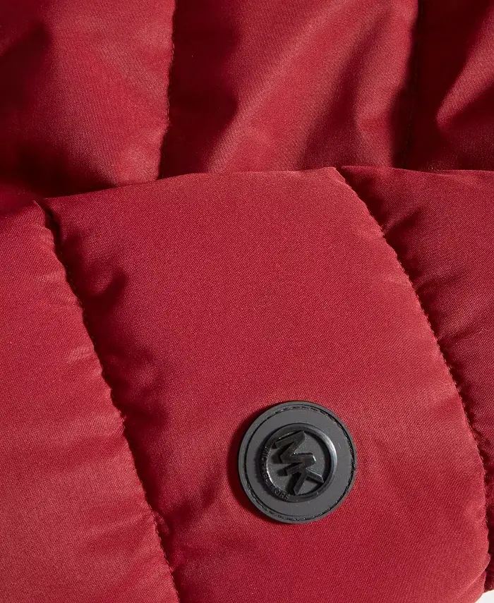 The Michael Kors hooded bomber has a nylon bib inset and is perfect for a night out on the town. Hits at hip Hooded with drawstring; front zip closure Attached nylon bib; knit cuffs and waist Hip pockets Long sleeves Water resistant; wind resistant Shell, lining, and fill: 100% polyester Machine wash Imported