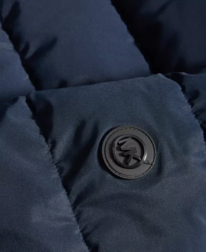 The Michael Kors hooded bomber has a nylon bib inset and is perfect for a night out on the town. Hits at hip Hooded with drawstring; front zip closure Attached nylon bib; knit cuffs and waist Hip pockets Long sleeves Water resistant; wind resistant Shell, lining, and fill: 100% polyester Machine wash Imported
