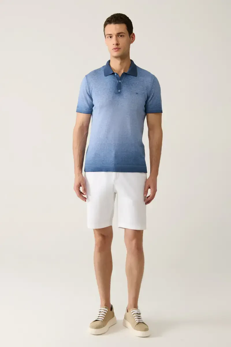 Men's knitted t-shirt, indigo polo collar, dye effect t-shirt, 3-button t-shirt, men's clothing, modern men's t-shirt, stylish men's t-shirt, comfortable knitwear, cotton t-shirt, men's fashion