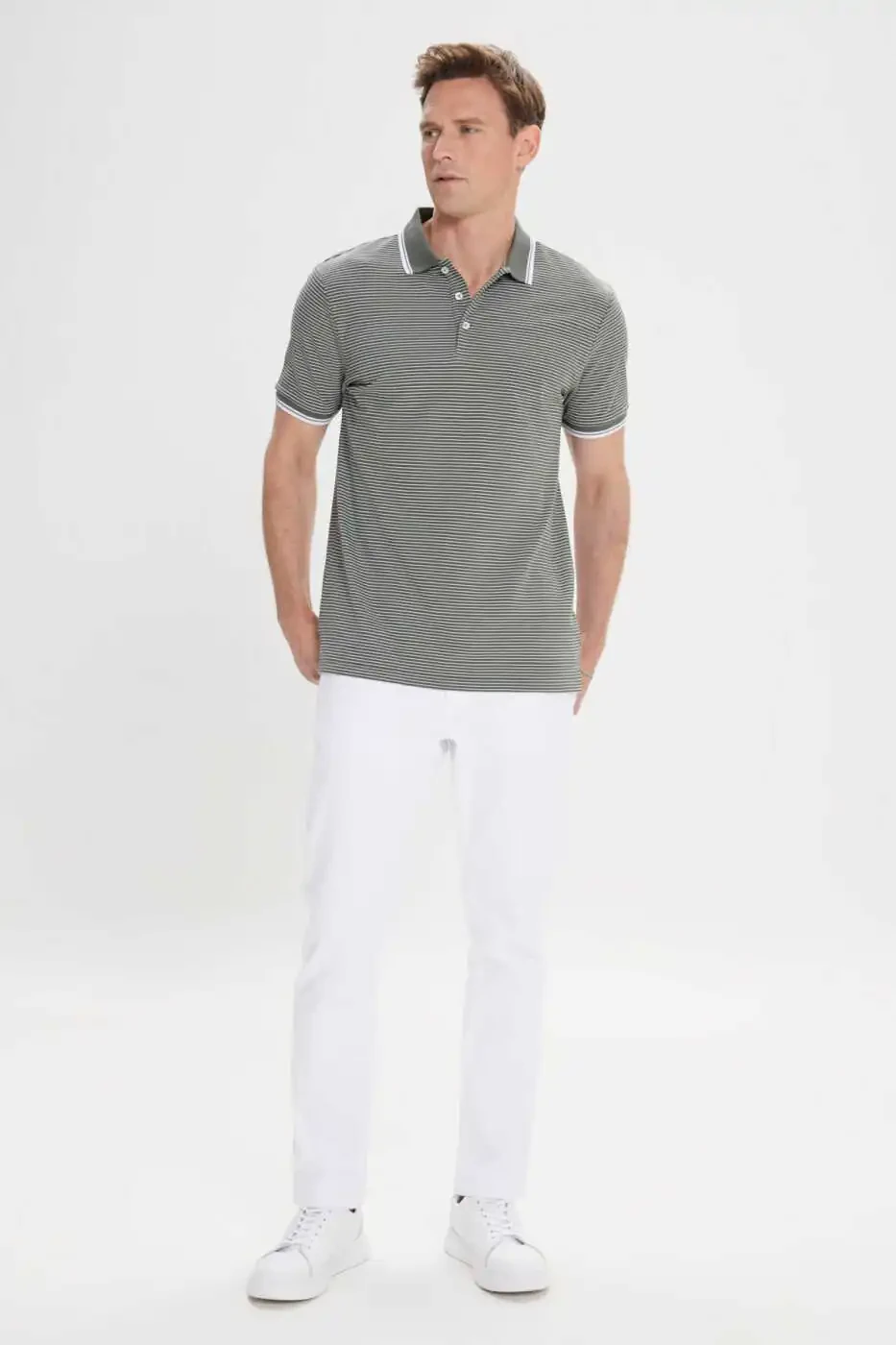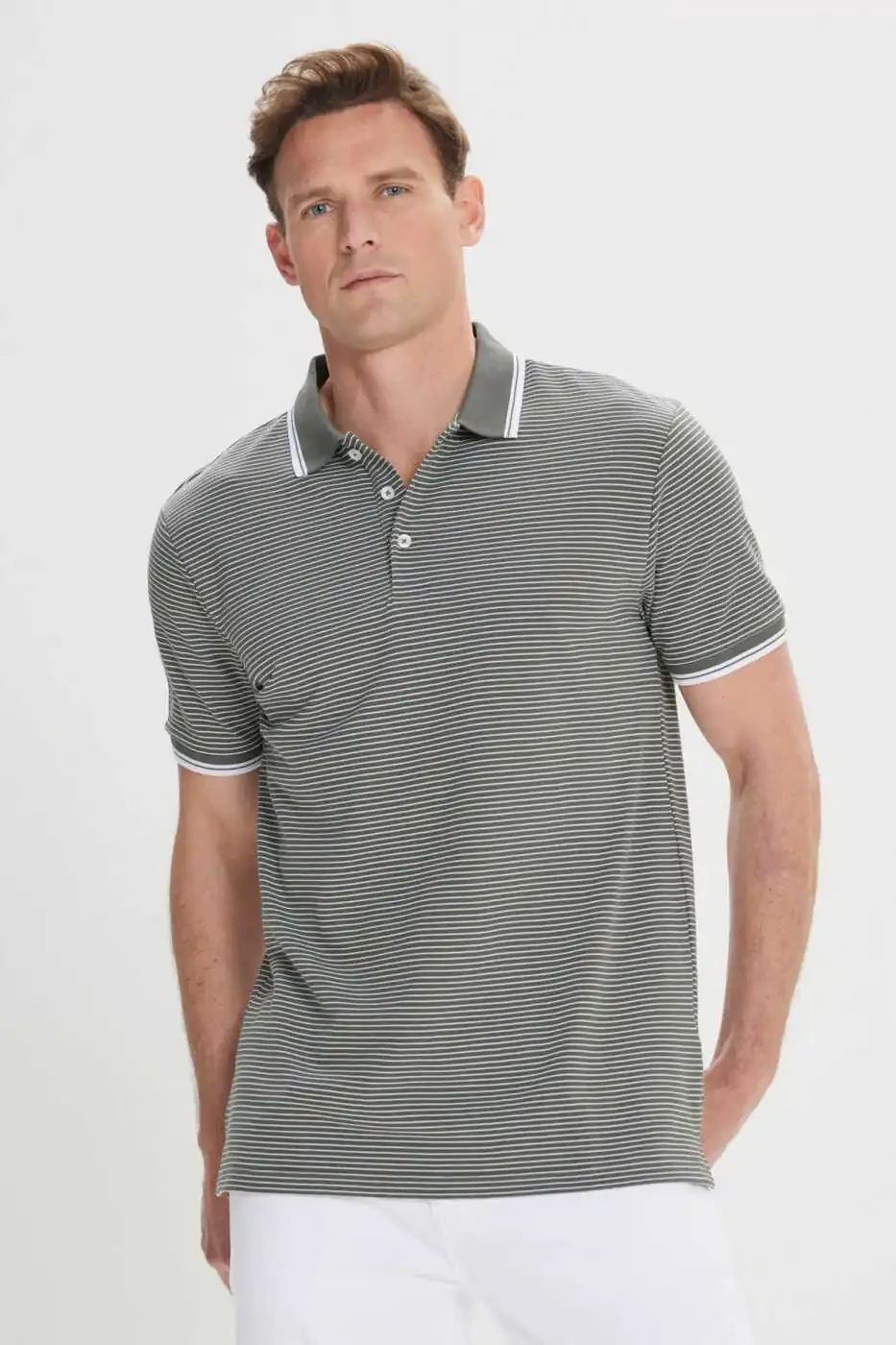 One of the indispensable pieces of the men's wardrobe, polo shirts offer both elegance and comfort. This slim fit polo shirt, which gains a modern and stylish look with its khaki-white striped pattern, meets you with Altınyıldız Classics quality. Thanks to its knitted fabric structure, this breathable and freedom of movement t-shirt offers comfort throughout the day with its cotton content. This t-shirt, which adapts to your body lines with its narrow cut, allows you to be comfortable without sacrificing your elegance both in daily life and on special occasions. The polo collar detail offers a classic and timeless elegance, while the short sleeves keep you cool in hot weather. The harmony of khaki and white colors easily adapts to all your combinations, completing your style. You can use this t-shirt in different styles by combining it with jeans, chino pants or shorts. Moreover, thanks to its easy care instructions, it stays like the first day for a long time. Don't miss this t-shirt, produced in extremely limited numbers! Order now to take advantage of the campaign price and upgrade your style. Hurry up to take advantage of this opportunity, stocks are running out! Remember, this product comes to you with the assurance of Altınyıldız Classics.