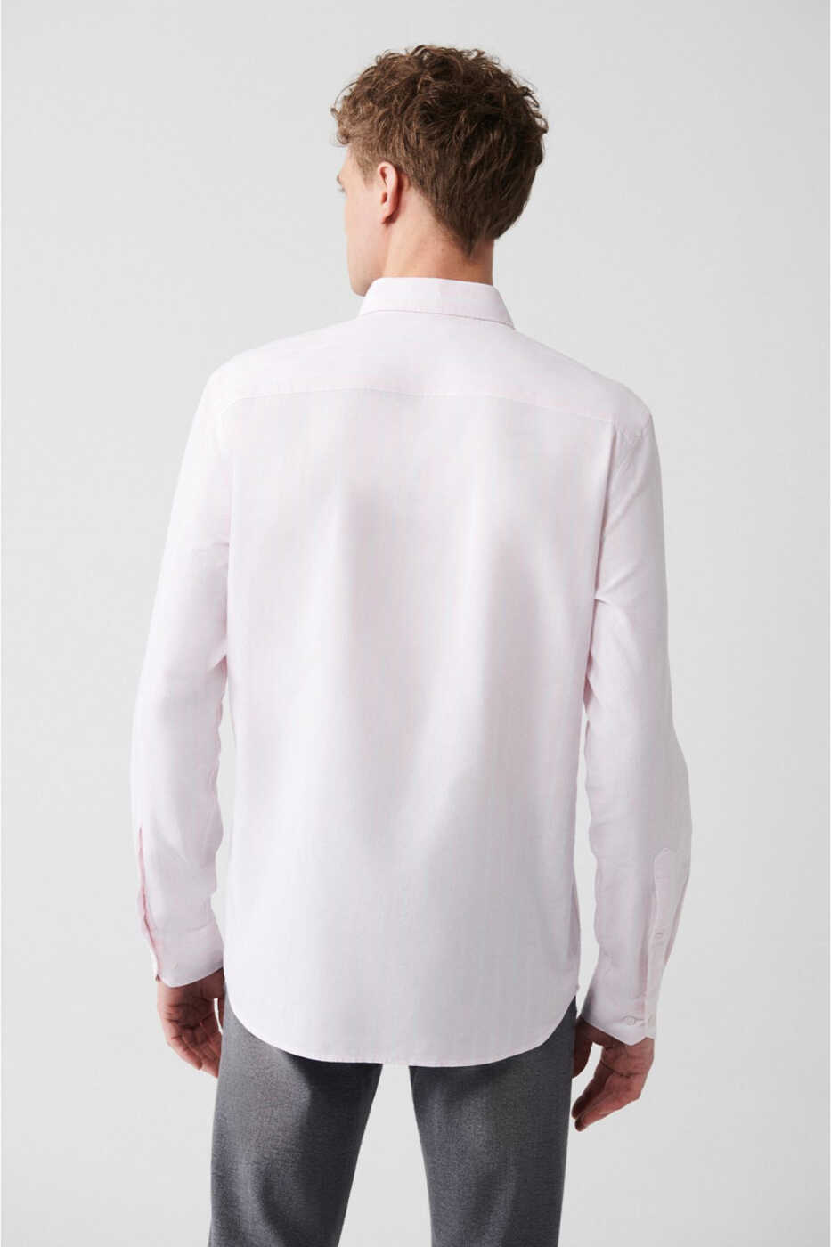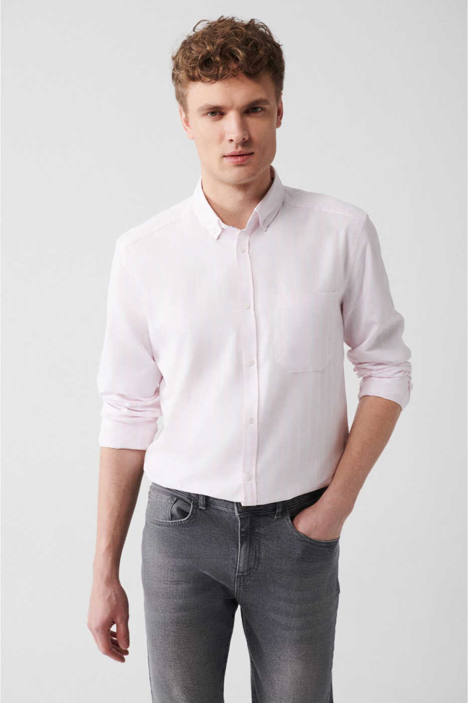 This men's light pink 100% cotton Oxford button-down collar striped regular fit shirt combines style and comfort, making it an essential part of your wardrobe. Its lightweight and breathable fabric provides all-day comfort, while its elegant stripes and light pink color will help you complete your style. Made from high-quality cotton fabric, the shirt is durable and long-lasting. Whether in business meetings or everyday life, it will make you look stylish and confident in any environment.