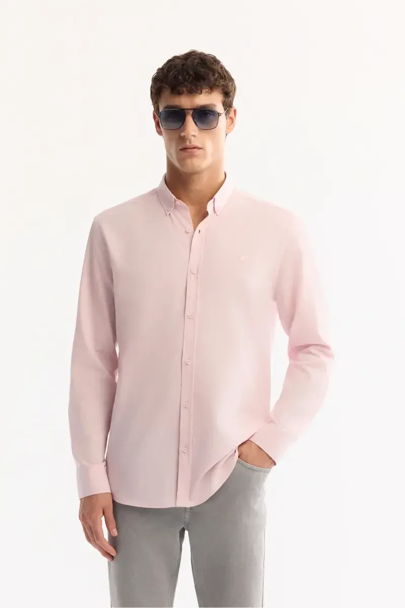 The perfect choice to add a modern touch to your everyday style! This shirt, which stands out with its light pink color, combines breathability and comfort with its linen texture. Made from 100% cotton fabric, the shirt provides a perfect fit for every body with its buttoned collar and Comfort Fit cut.