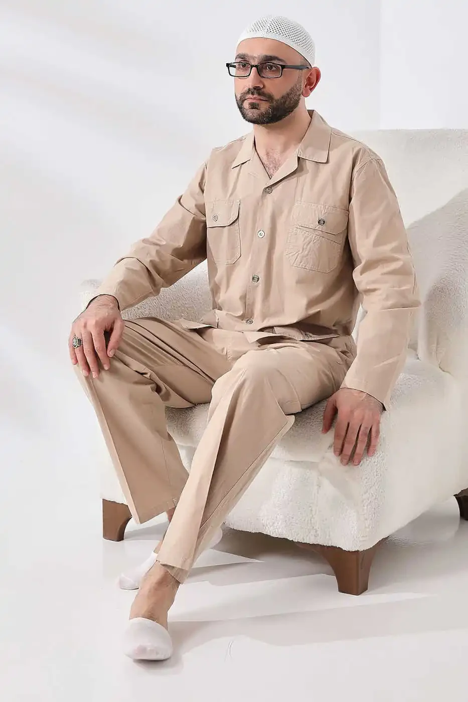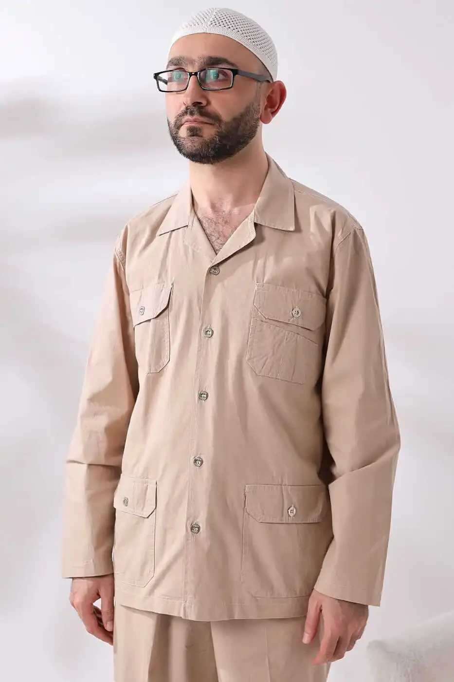 Men's Linen 4-Pocket Two-Piece Safari Suit for Hajj and Umrah in Beige | Ihvan Online